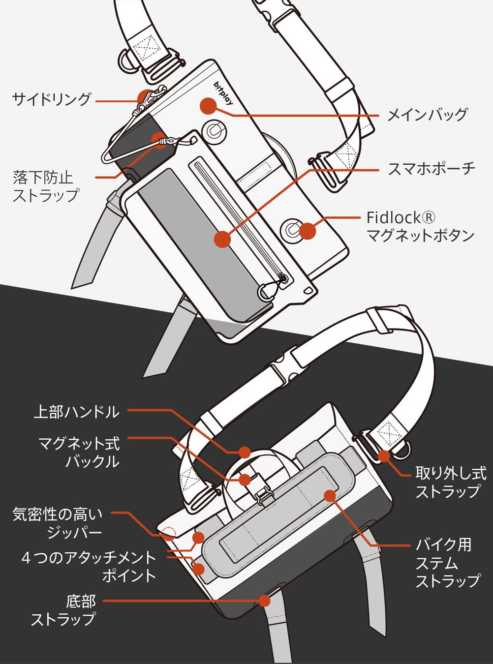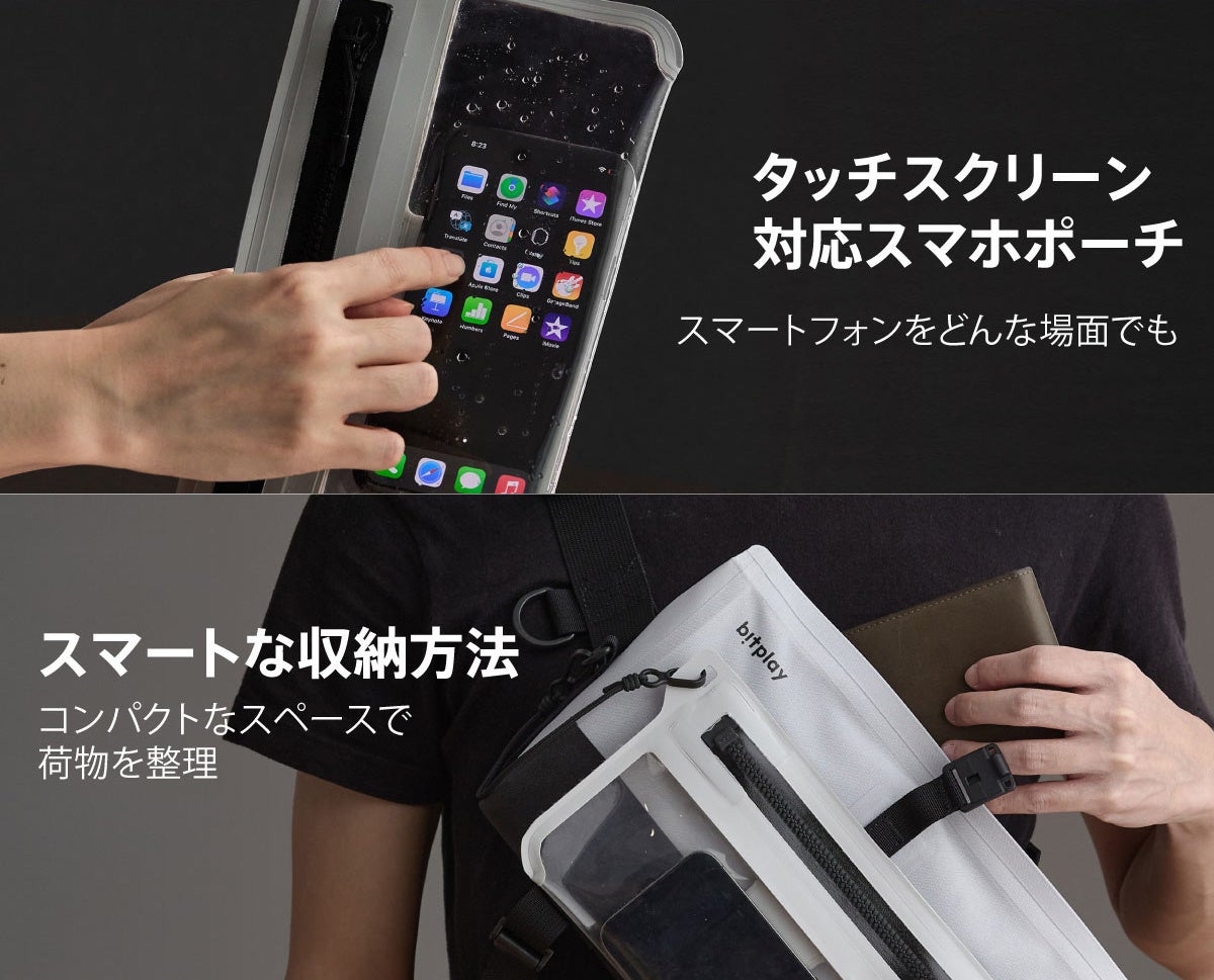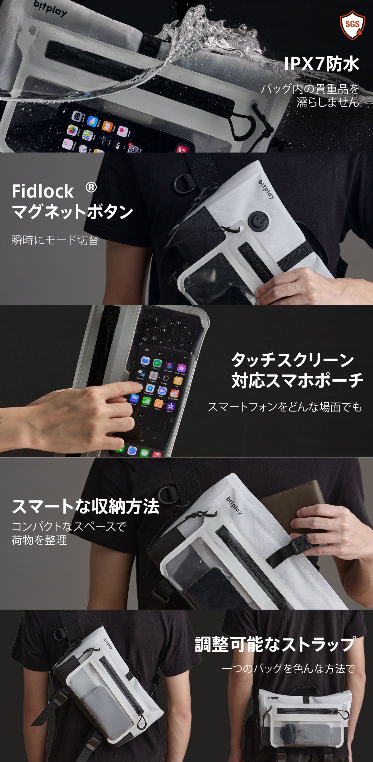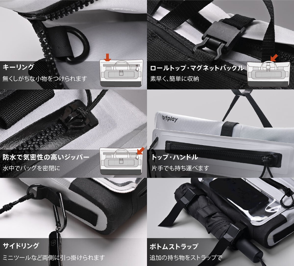 2:AquaSeal Active防水バッグを水の中に入れる前に、バッグの外観を確認し、破損等問題がないことを確認し、貴重品等をバッグに入れる前に水中での防水性能をしっかりとご確認ください。事前に水中30cm下において10分間、本バッグを入れて防水テストを行って下さい。防水ジッパーは最後までしっかりと締めて下さい。お客様のスマートフォンおよび貴重品についてbitplay及び弊社は一切の責任を負いません。