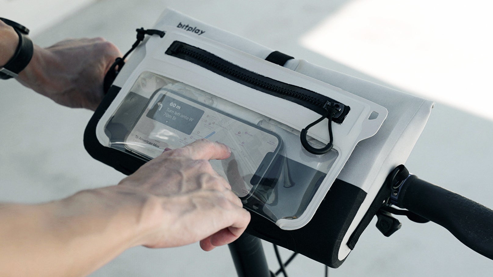 バッグを自転車のステムに固定して、スマートフォンに直接アクセスすることができ、雨の日でも道案内が可能です。