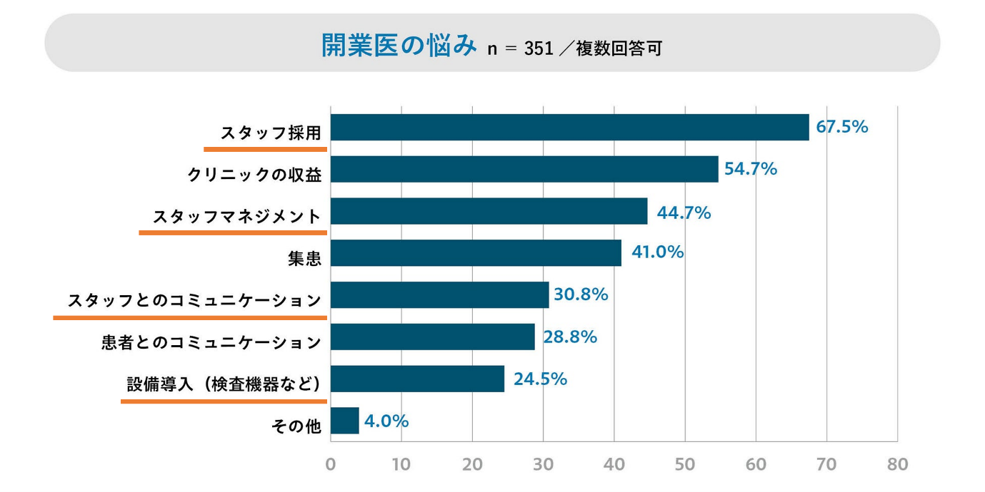 当社調査によると、スタッフに関する悩みは、多くの開業医に共通してみられます。