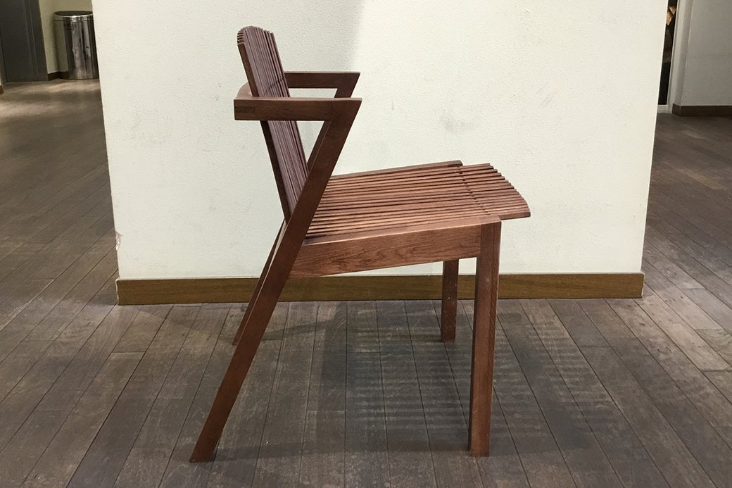 シートと背中がすのこのようになっています。光が当たると影が美しく映し出され、それだけでもお部屋が上質な雰囲気になります。座面と背もたれの先端は切りっぱなしになっており、それぞれの長さを変えることで曲線が描かれるような構造です。曲線をデザインすることで、切りっぱなしの雑なイメージが払しょくされ、繊細なイメージになっています。前後左右、どこからみても美しいチェアです。