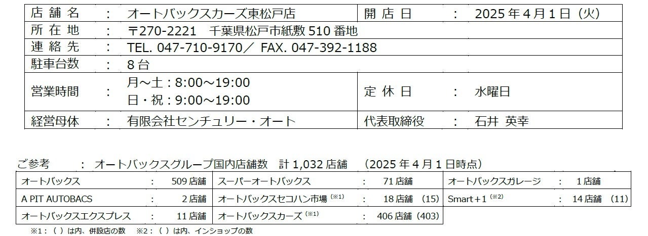株式会社オートバックスセブン(代表取締役 社長:堀井勇吾)が展開する車買取・販売事業「AUTOBACS CARS(以下、オートバックスカーズ)」は、オートバックスカーズフランチャイズ契約を有限会社センチュリー・オート(代表取締役:石井英幸)と締結し、2025年4月1日(火)に「オートバックスカーズ東松戸店」をオープンいたします。