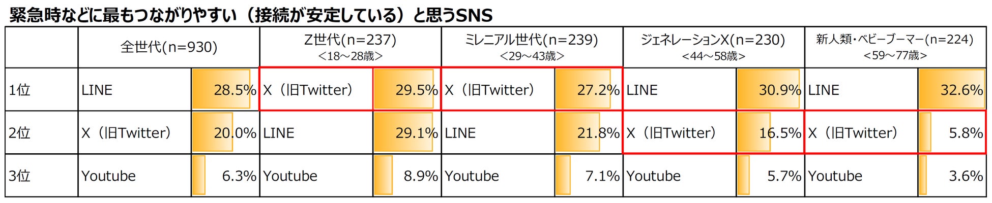 普段SNSを利用していると回答した930名を対象に、災害時に最もつながりやすい(接続が安定している)と思うSNSを聞いたところ、全世代で最も多かったのは「LINE(28.5%)」で、次いで「 X(旧Twitter)(20.0%)」、「YouTube(6.3%)」と続きました。世代別に見ると、Z世代とミレニアル世代ではX(旧Twitter) がLINEを上回り、それぞれ29.5%、27.2%となりました。