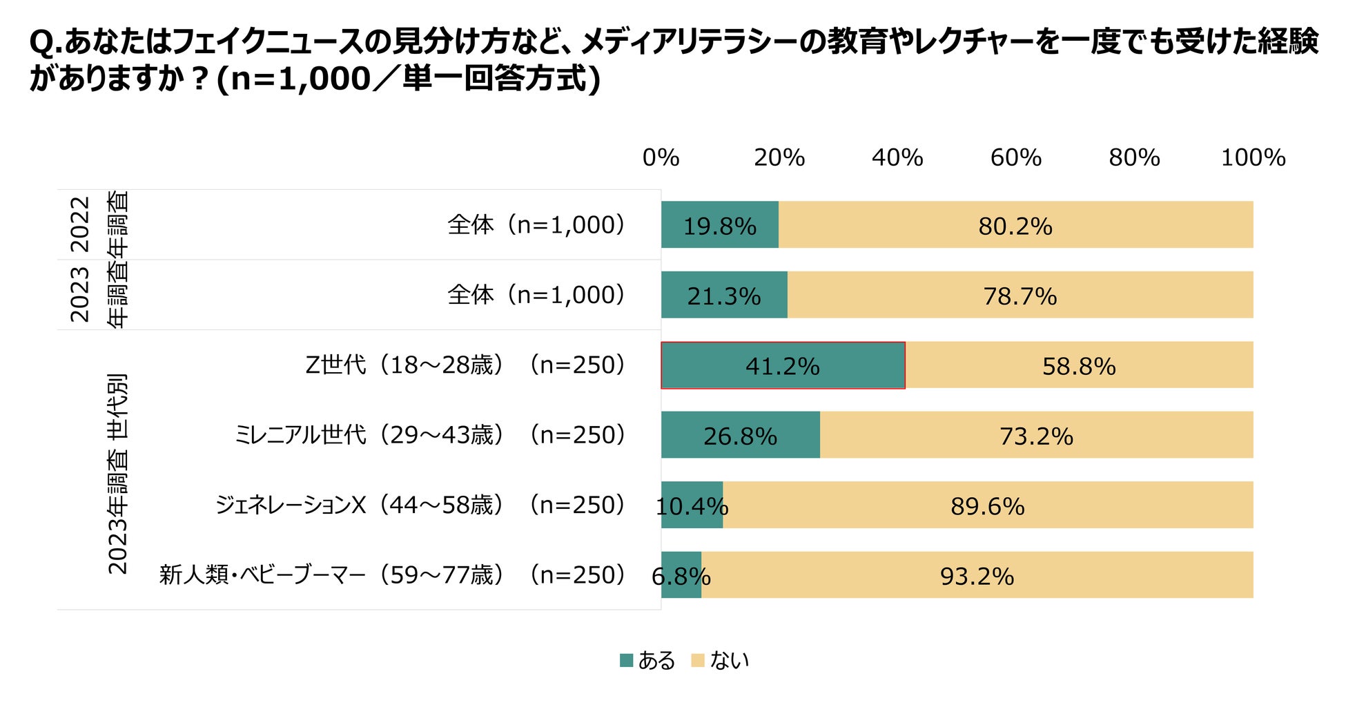 フェイクニュース対策の教育を受けた経験 21.3%(Z世代は41.2%)