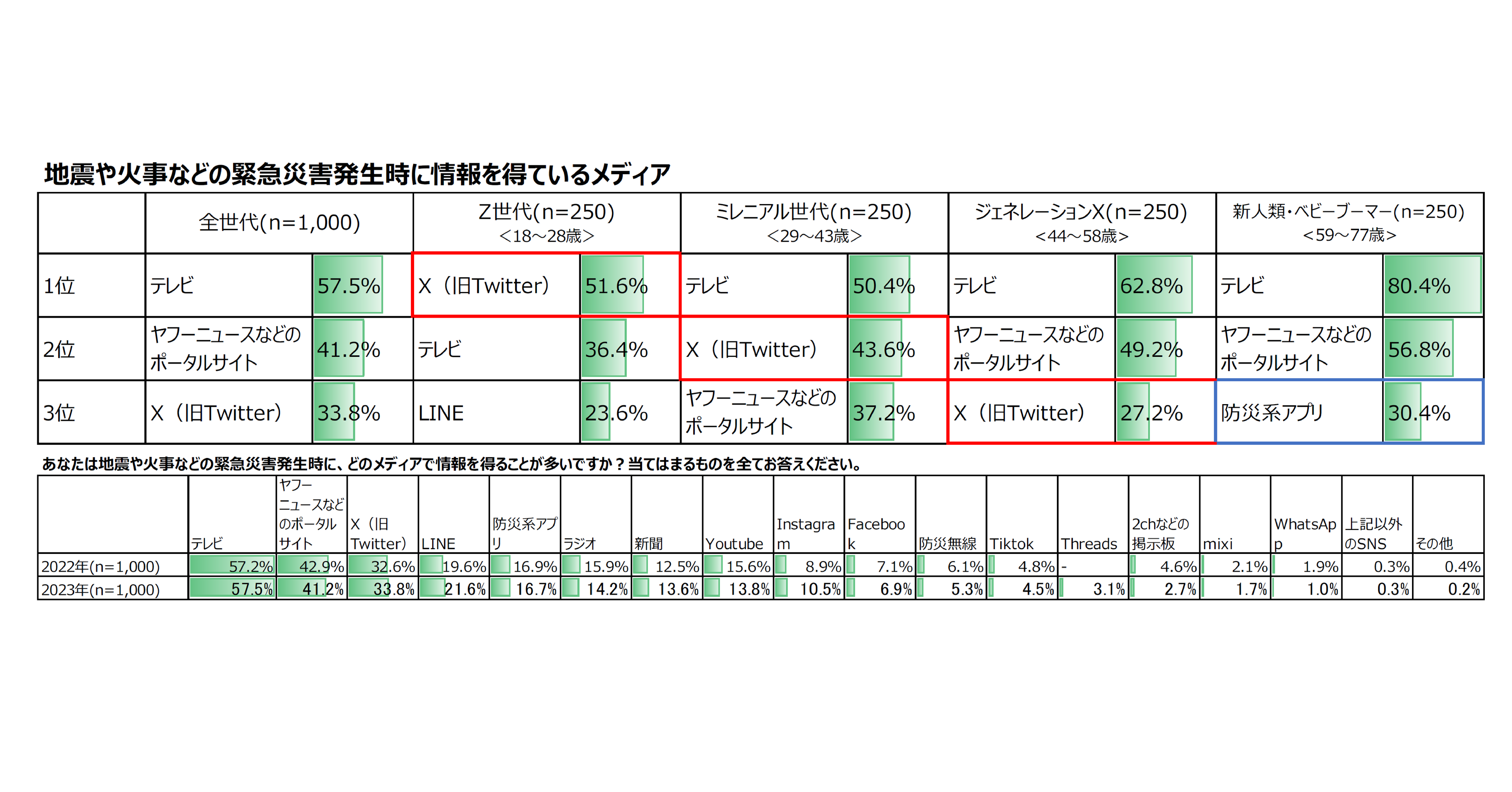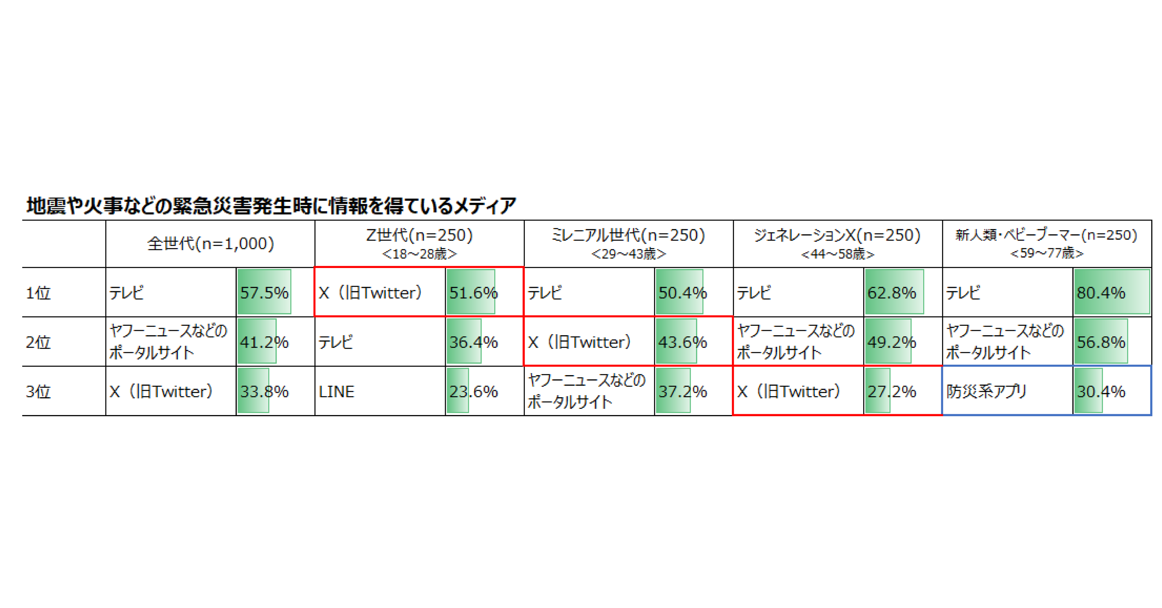 災害時の情報取得メディア、Z世代ではX(旧Twitter)がテレビを上回り最多(51.6%)