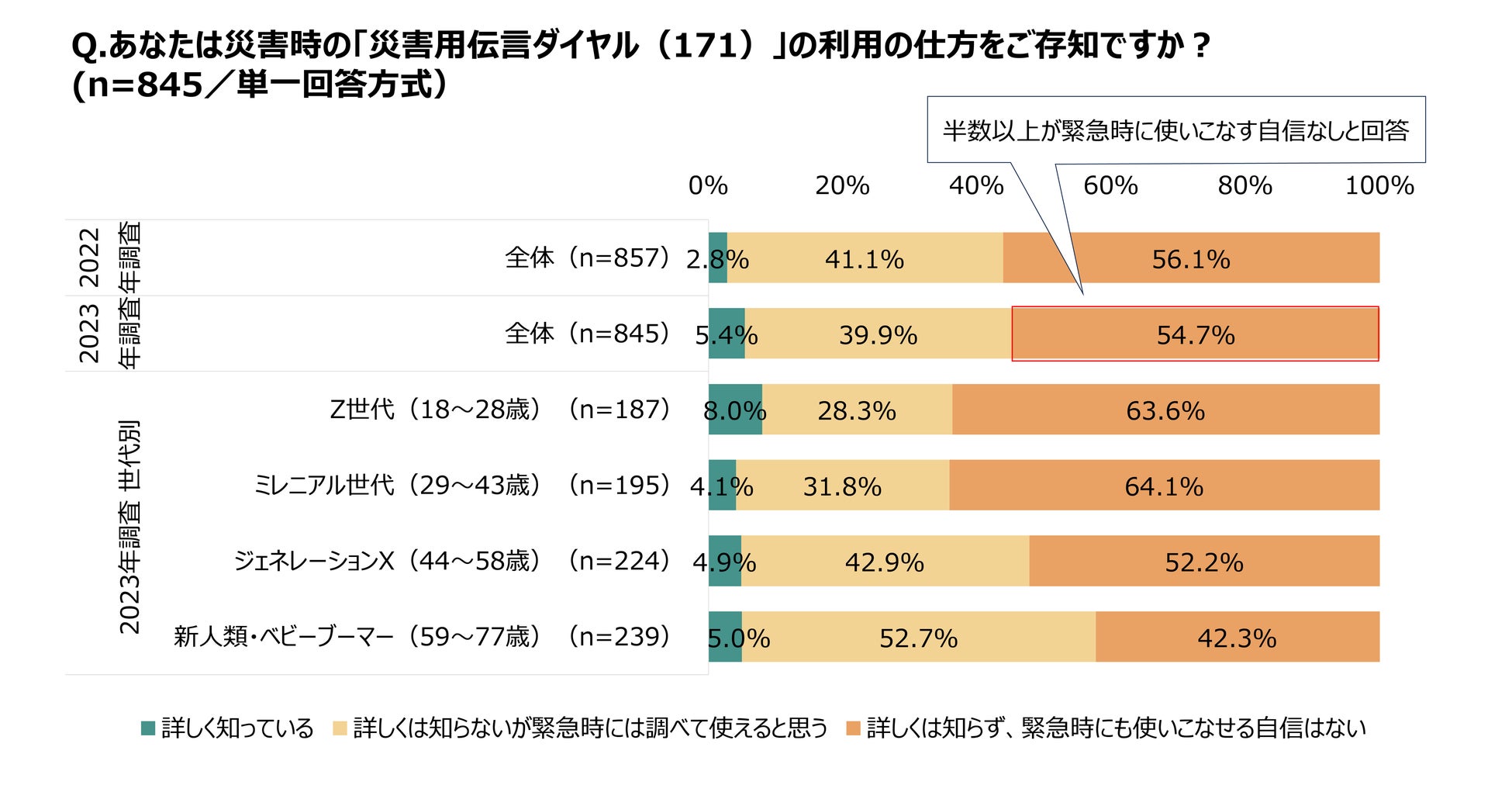 災害時の災害用伝言ダイヤル(171)を利用したことがないと回答した845名を対象に、利用の仕方を知っているか聞いたところ、「詳しく知っている」と回答したのは、2022年調査時の2.8%から2.6ポイント増加したものの、全世代では5.4%にとどまり、「詳しくは知らないが緊急時には調べて使えると思う」が39.9%、最も多かったのが「詳しくは知らず、緊急時にも使いこなせる自信はない」で54.7%という結果となりました。