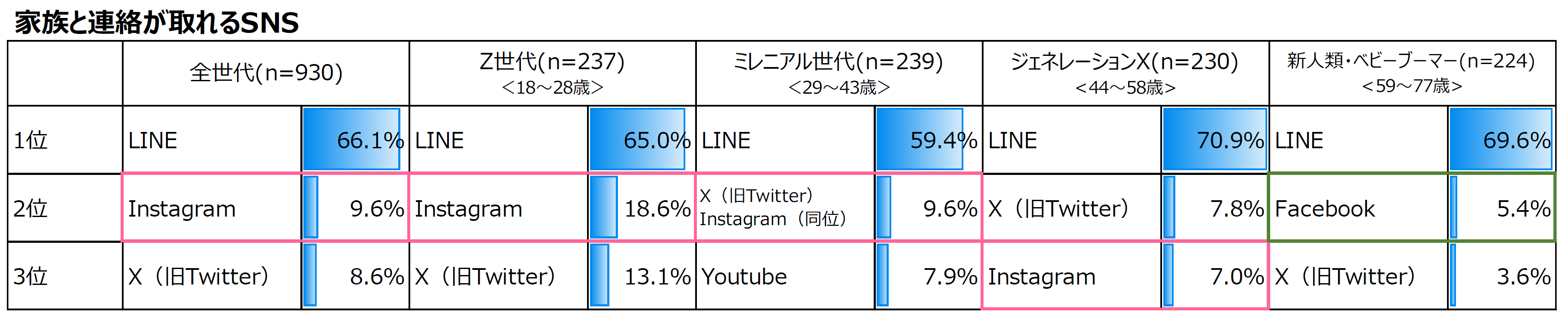 家族と連絡が取れるSNSはLINEが最多、若年層はInstagram、年配層はFacebookも利用