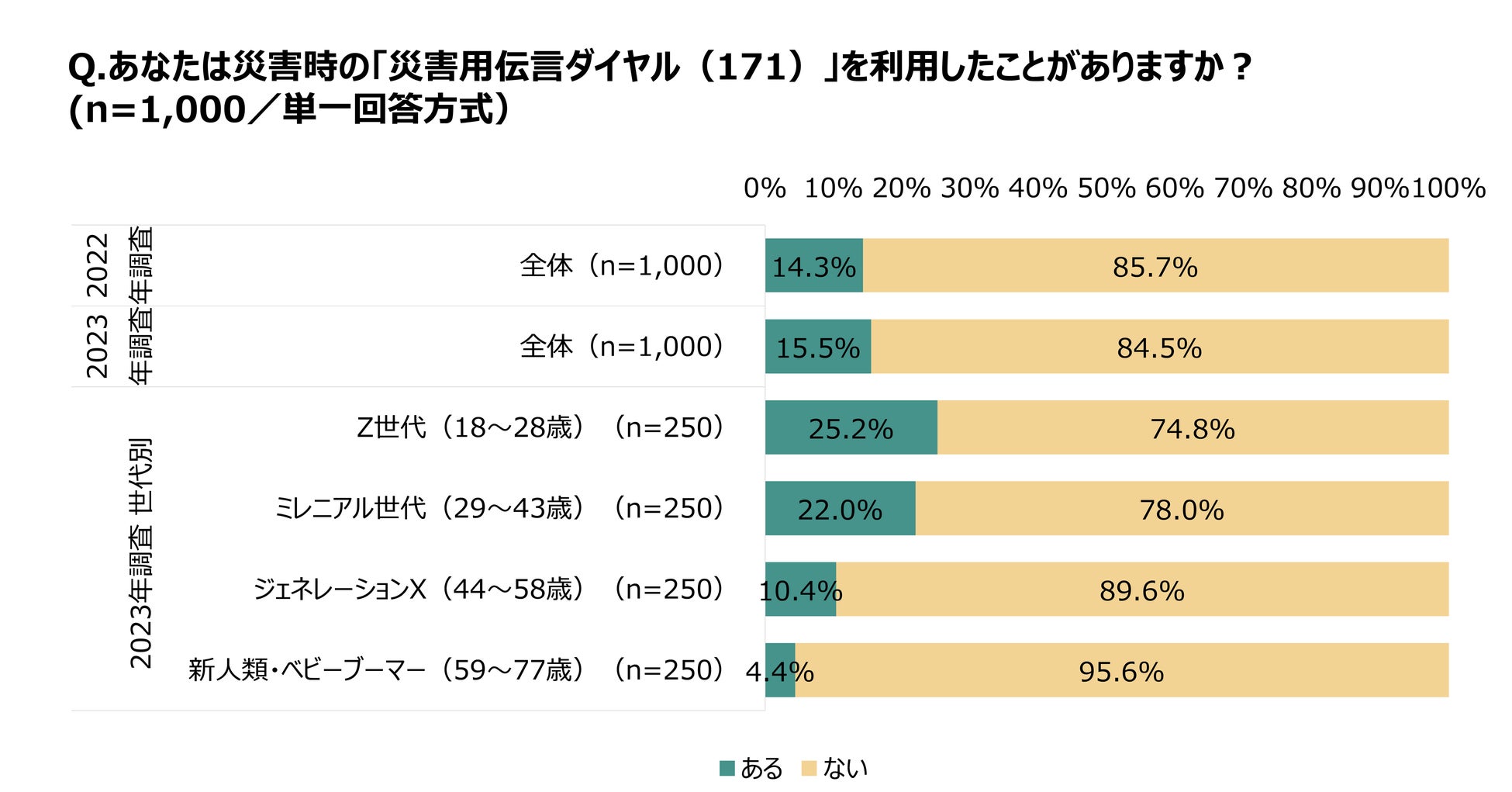 災害時の災害用伝言ダイヤル(171)を利用したことがあるかを聞いたところ、利用率は全世代で15.5%という結果となりました。世代別ではZ世代の利用率が25.2%と最も高い結果となりました。