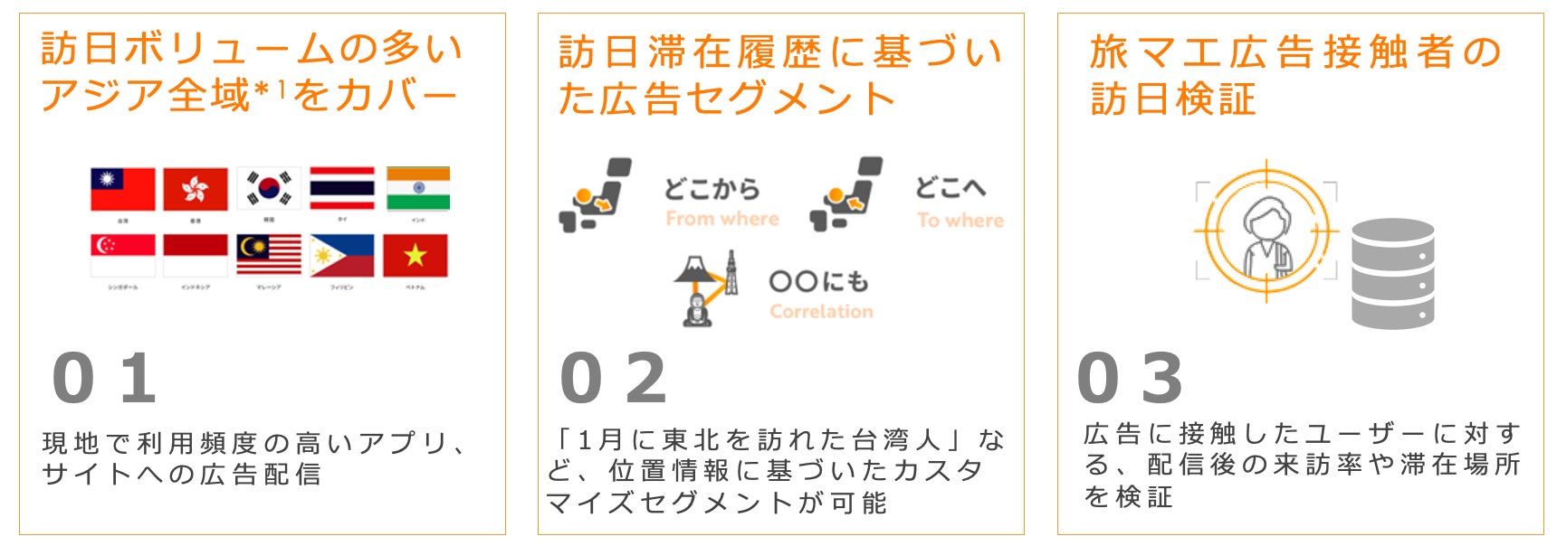 訪日ボリュームの多いアジア全域をカバーしており、現地で利用頻度の高いアプリ、サイトへの広告配信や訪日滞在履歴に基づいた広告セグメントが可能です。