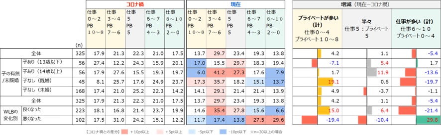 興味深いのは子あり(14歳以上)で、「仕事0〜2/PB10〜8」「仕事8〜10/PB2〜0」が共に10pt以上減少し、現在は「仕事3〜4/PB7〜6」「仕事5/PB5」のゾーンに集中する結果となっています。コロナ禍では仕事とプライベートのバランスが家庭によって様々であったのに対し、アフターコロナで本来のバランスを取り戻したと推測されます。