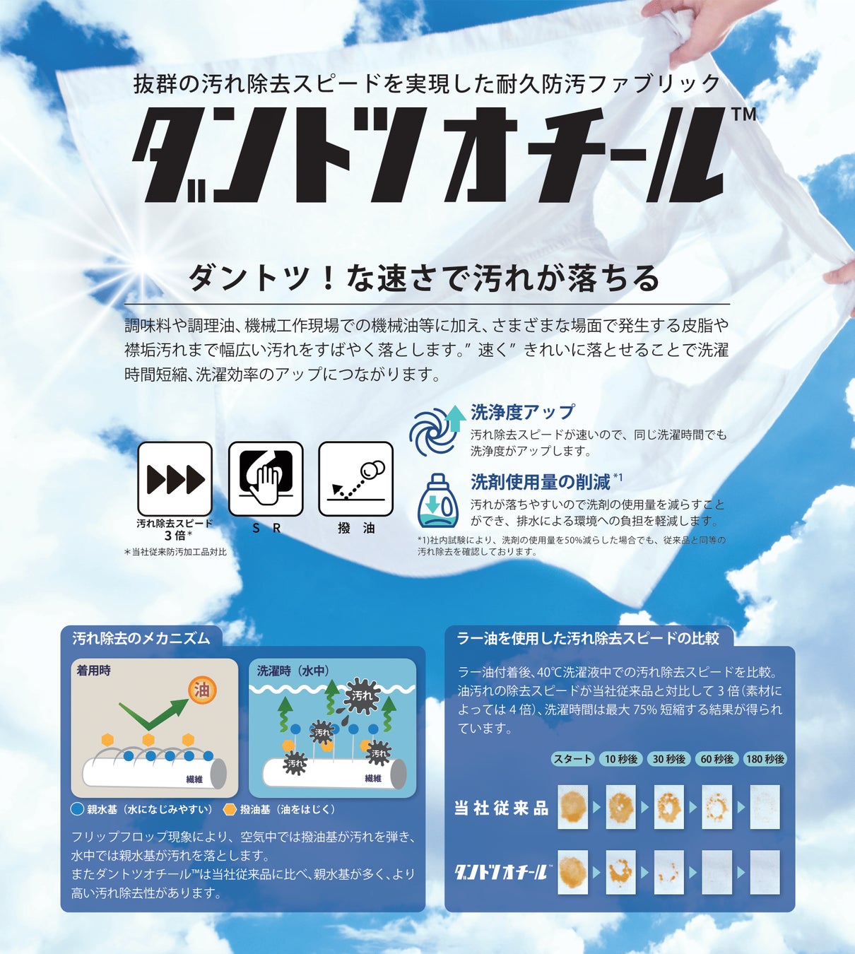 小松マテーレが開発した防汚加工ファブリックです。調味料や調理油、機械工作現場での機械油等に加え、さまざまな場面で発生する皮脂や襟垢汚れといった幅広い汚れを、すばやく、きれいに落とします。