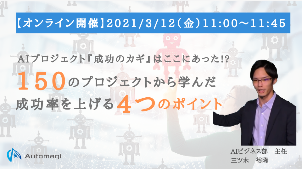 Automagi株式会社は3月12日(金)に、【AIプロジェクト成功の成功率をあげる4つのポイント】について、オンラインセミナーを開催いたします。