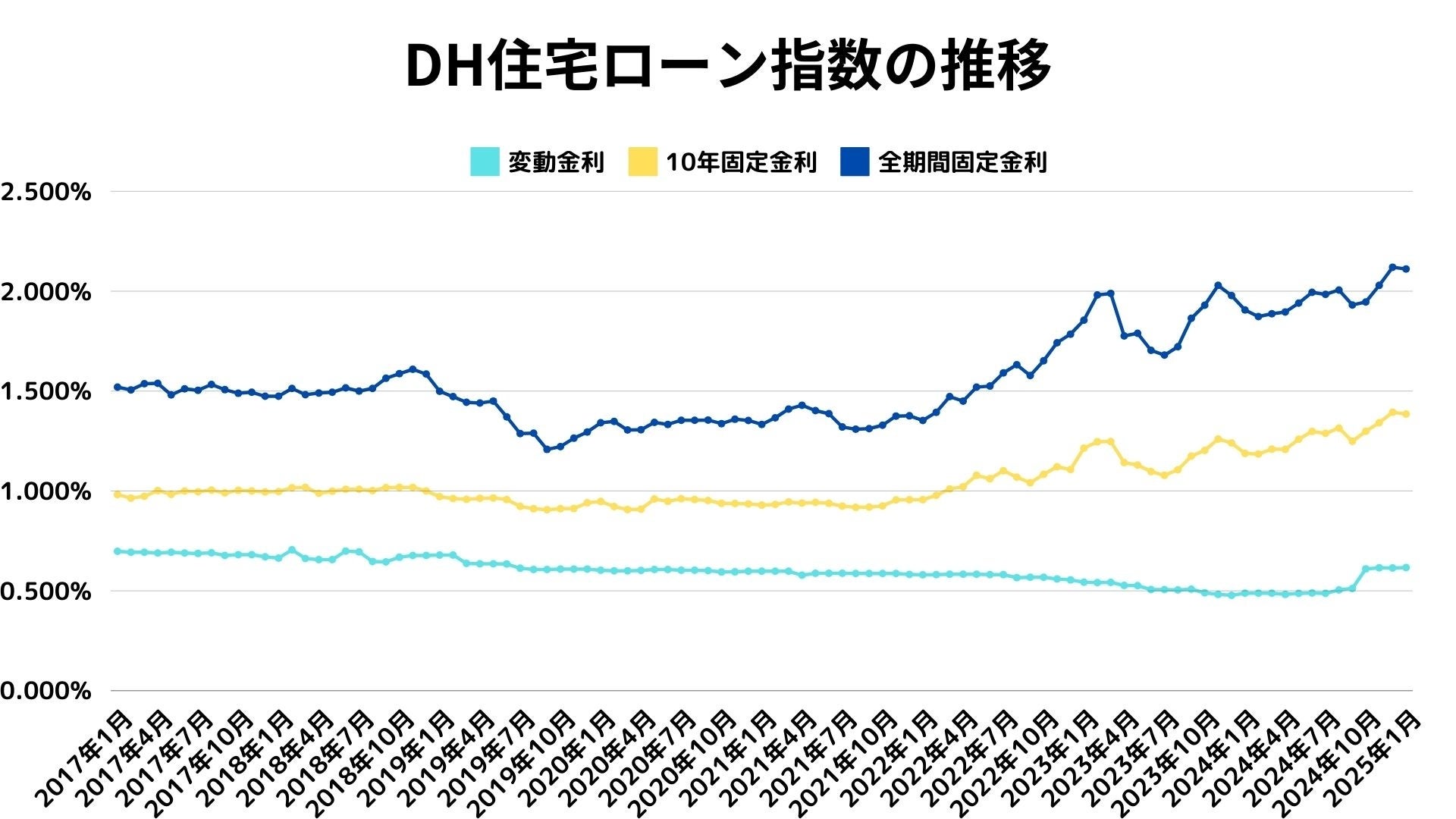 今月は、DH住宅ローン指数の10年固定は1.385%と前月の1.394%から下落した一方、1年前の1.188%よりも上昇しました。