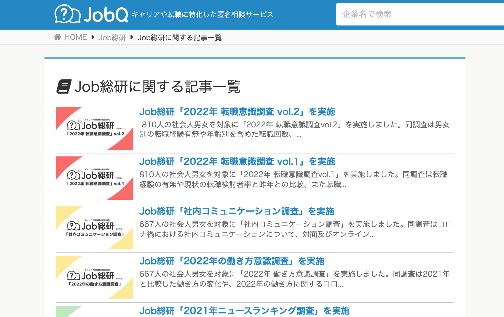 JobQ内のカテゴリ一欄にある「Job総研」に社会人を対象に実施する様々な調査資料が掲載されています。就転職やキャリアの調査概要および調査結果他、関連相談Q&Aを併せてご覧になれます。Job総研が発信している記事は主に、「就活」「転職」「働き方」「女性推進」「SDGs」といったカテゴリに分かれており、各々色別されているため、自身が知りたい内容を簡単に検索し知ることができます。