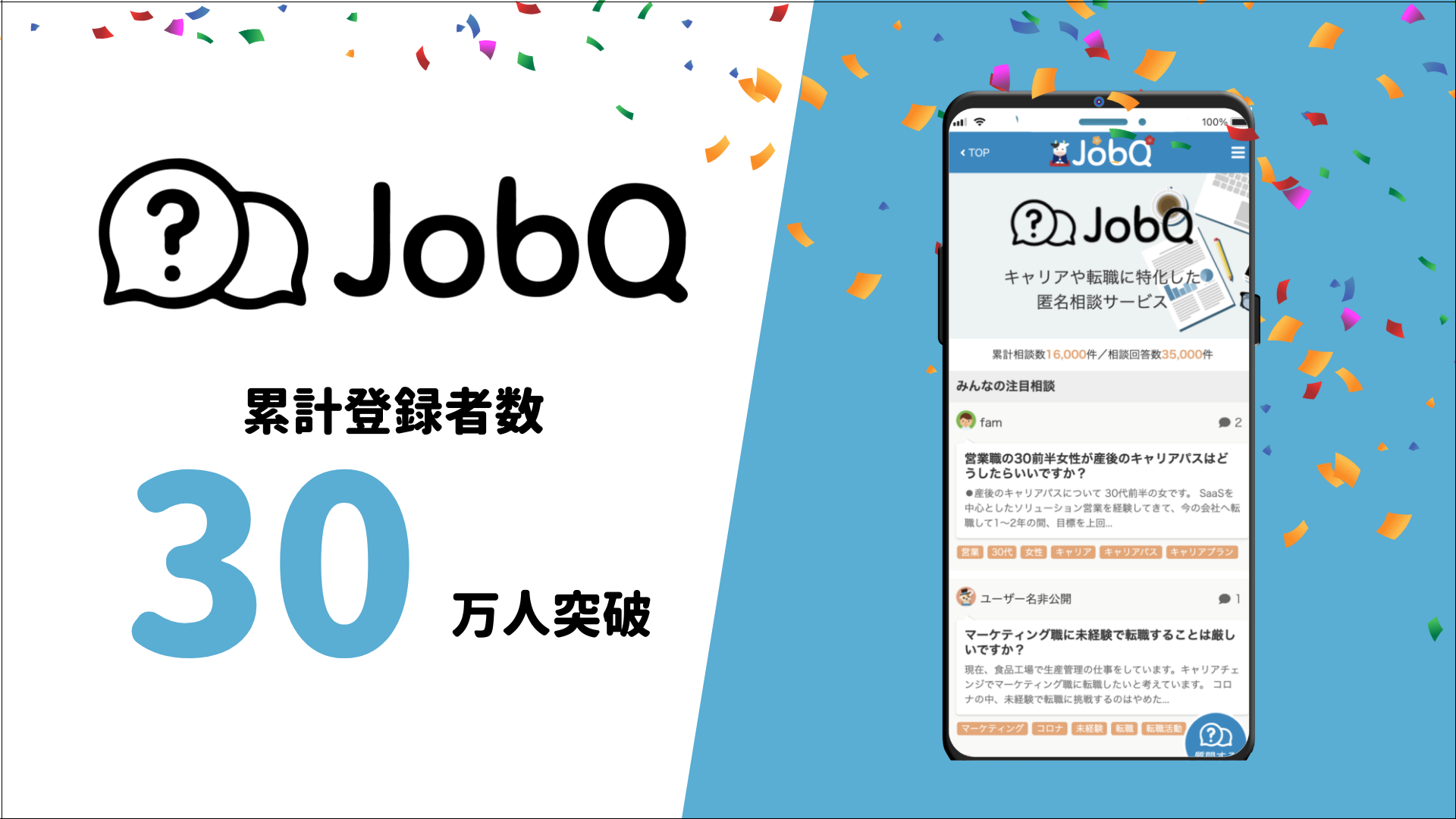 キャリアや就職・転職に特化した匿名相談サービス『JobQ(ジョブキュー) (※1)』(以下JobQ)を運営する株式会社ライボ(本社:東京都渋谷区 代表取締役:小谷匠 以下「ライボ」)は、同サービスの累計登録者数が2022年1月に30万人を突破し、キャリアや就職・転職全般に関する研究や各種調査を行う機関「Job総研(※2)」が新カテゴリとして追加されたことをお知らせします。