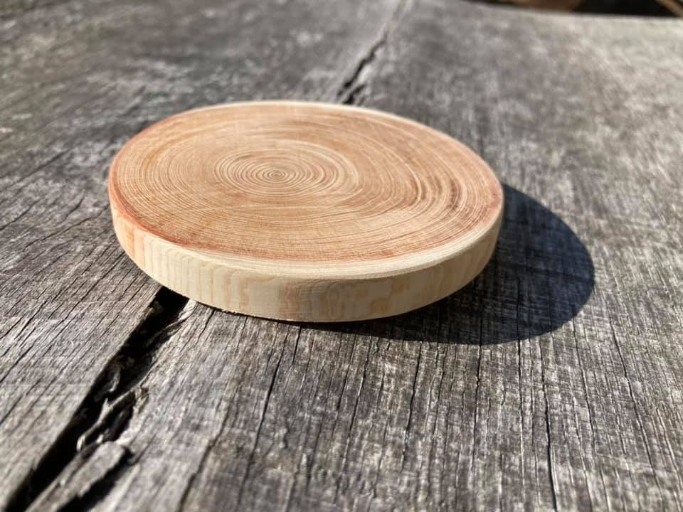 伐採の際に切り落とされ山に捨てられていた枝を利用できないかと考え、つくられた商品。年輪が美しいコースター。