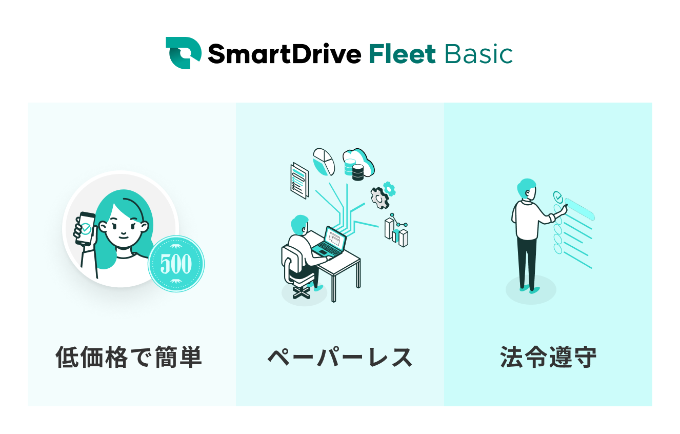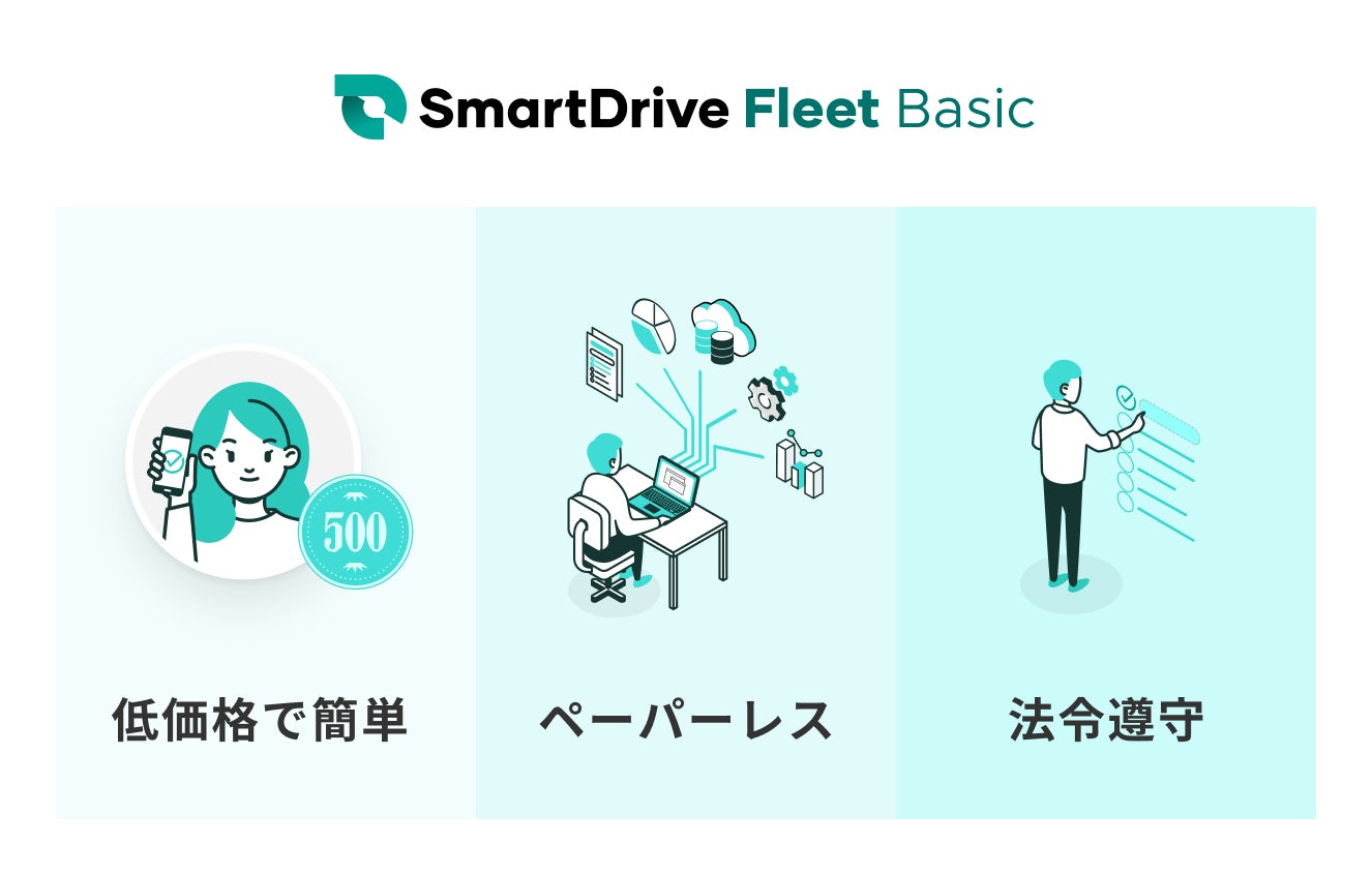 「SmartDrive Fleet Basic」は、紙やエクセルでの煩雑な管理・運用に悩まれている安全運転管理者や車両管理者向けに、社用車の乗車前後のアルコールチェック記録管理や運転日誌の作成、日常点検、車両予約など法令上必要な業務をスマホだけでも簡単登録でき、クラウド上での一括管理によるペーパーレス化により業務を効率化することが大きな特徴です。また、車載デバイスを購入することなく1ID月額500円から利用可能となっており、道路交通法など法令遵守体制を手軽に強化することができます。