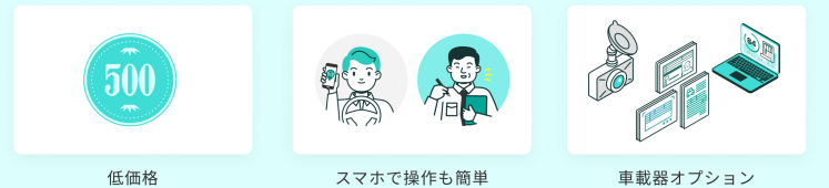 ①低価格で簡単:1人あたり月額500円から導入でき、車載器を追加すれば車両の動態管理や安全運転推進も可能に