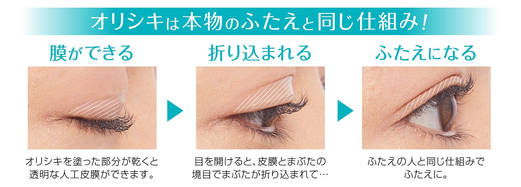 『ORISHIKI(折式 オリシキ)』は、まぶたに塗って乾かすだけで簡単に自然なふたえまぶたを作ることが出来るふたえコスメです。2018年の発売以降、累計販売数が400万個(*1)を突破し、また、美容クチコミアプリ「LIPS」にて2021年のベストコスメ1位(*2)を受賞するなど、ふたえコスメの人気商品として多くの方にご愛用いただいています。
