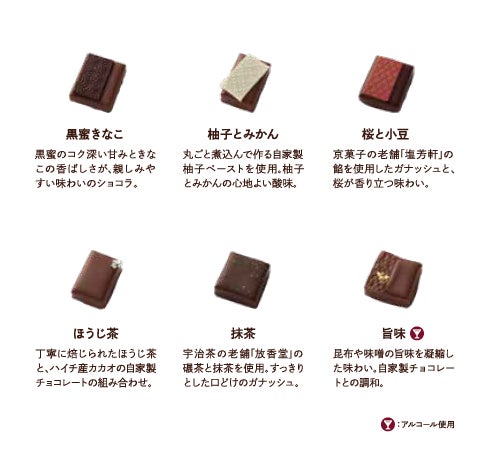 カカオ豆から手掛ける自家製のビターやホワイトチョコレートと、様々な和の素材を組み合わせたこのショコラのイメージは、枯山水の庭園を望む茶室。美しく柔和な空気感を感じられる詰め合わせをお楽しみください。