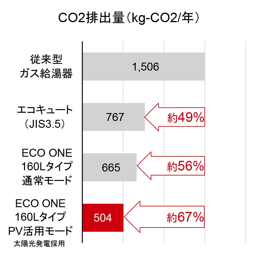 またCO2排出量は56%※3削減、さらに太陽光発電時間帯の余剰電力をかしこく使ってお湯をつくるPV活用モードでは、従来のガス給湯器と比べて年間約67%※4ものCO2排出量を削減することができます。