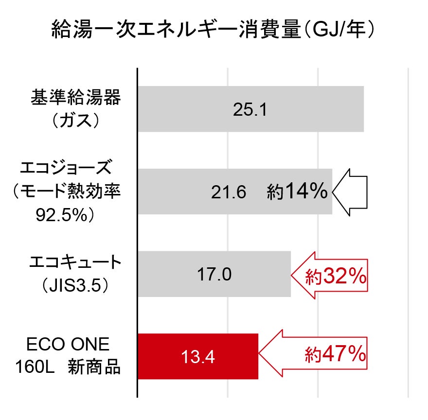 ガスと電気を効率よく利用することで高い省エネ性能を誇る「ECO ONE」160Lタイプは、省エネ設備の評価基準となる給湯一次エネルギー消費削減率において、業界最高レベルの47%※2を実現しました。