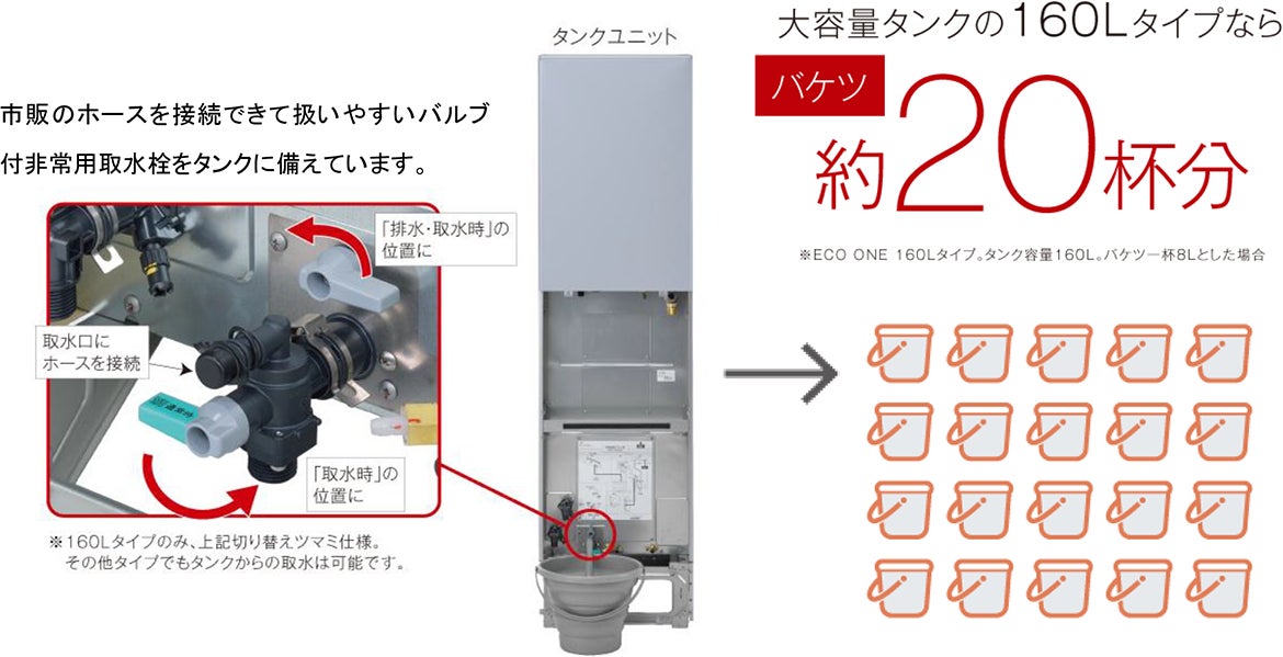 非常時、簡単な操作で貯湯タンク内の取水が可能に
