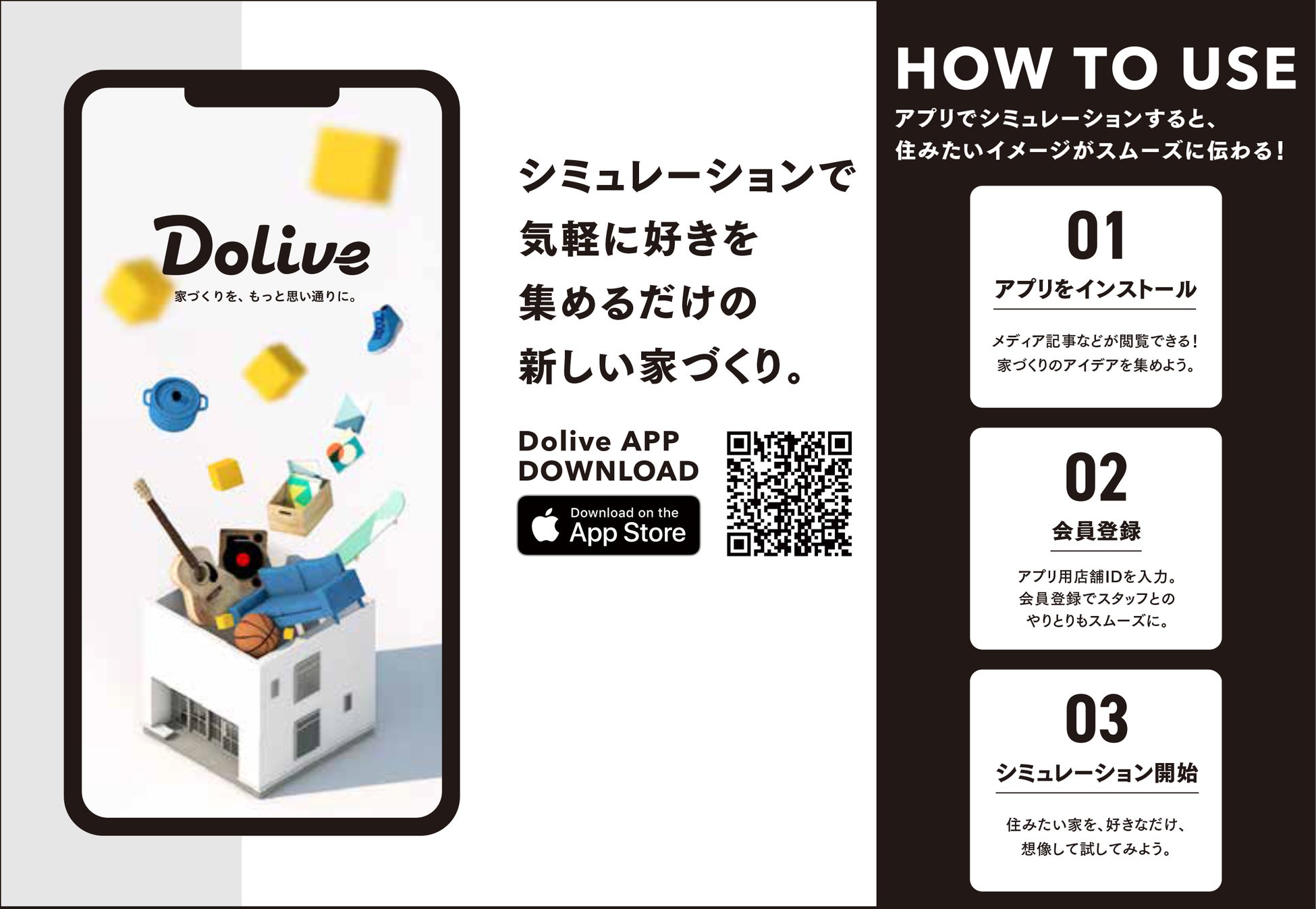 新しい発想で住宅デザインの考え方を提案・発信する「Dolive(ドライブ)」。家づくりのアイデア&ツールとして「Doliveアプリ」をリリース。ユーザーのイマジネーションを広げるリファレンスアイデアを次々と発信し、”住みたい”を形にするための家づくりソリューションを提供しています。FC事業として、全国160社以上のDolive取扱店にてサービスを展開しています。