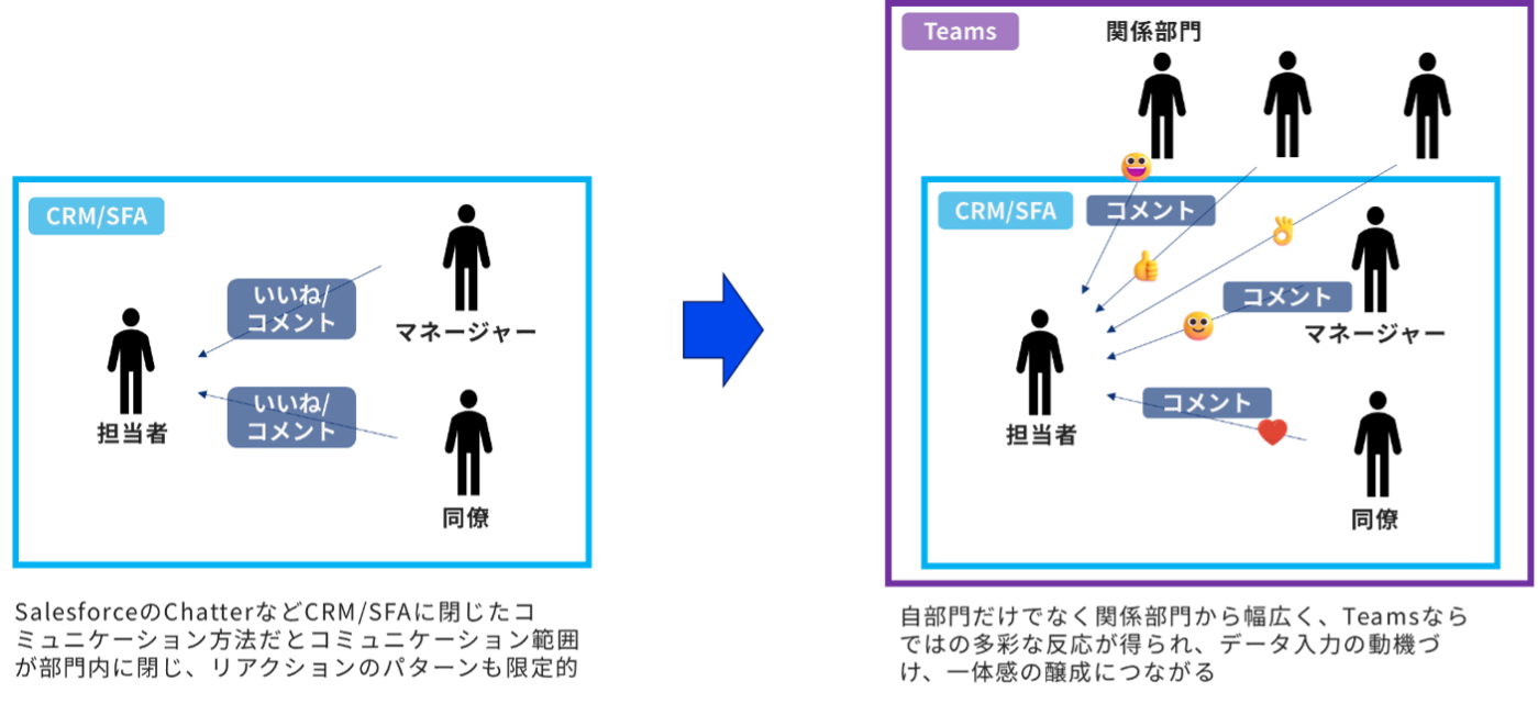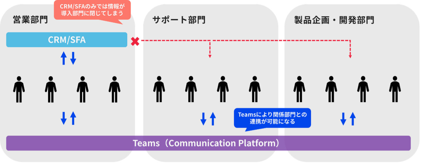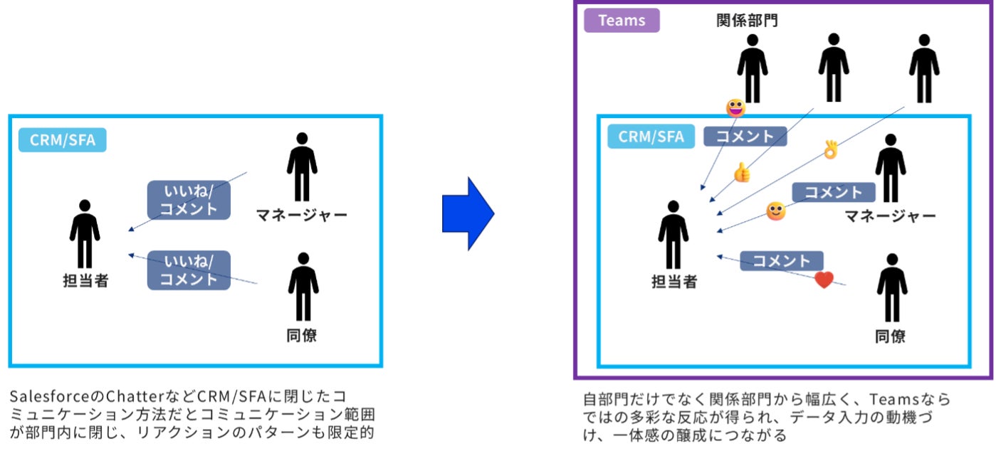 CRMにおける重要な役割の1つは情報の共有ですが、その共有の範囲はCRMの導入部門、特に頻繁にログインするユーザーに限定されがちです。多くの企業が全社的なコミュニケーションプラットフォームとして活用しているTeamsへの連携により情報共有、活用の幅が大きく広がります。