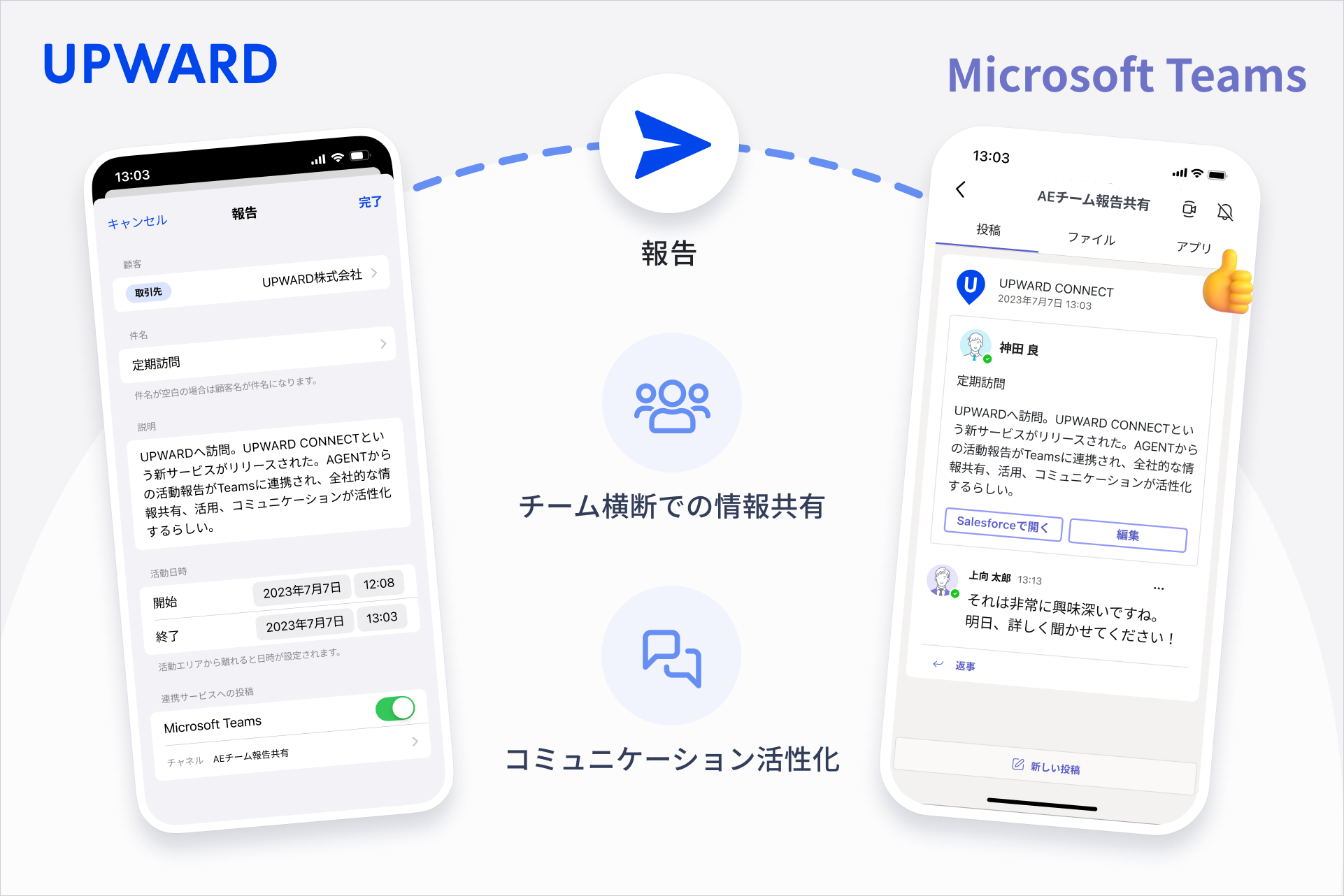 UPWARD CONNECTにより、「UPWARD」から入力した活動報告がMicrosoft Teams(以下 Teams)の任意のチャネルに投稿でき、Teams上からコメント、リアクション、報告内容の更新が行えます。
