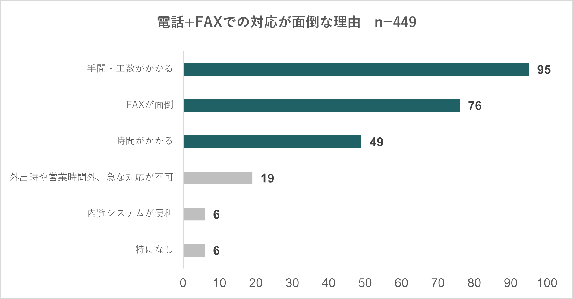 ■内覧する際に管理会社とのやり取りでもっとも面倒なものは「電話+FAX」で73%。その理由は主に時間や手間がかかるといったものだが、外出時や営業時間外、急な対応が難しいといった声も。