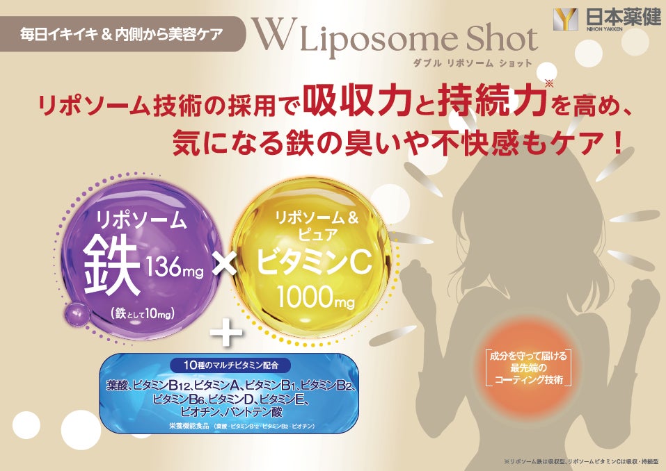 株式会社日本薬健(本社:東京都港区新橋二丁目20番15号、代表取締役:丸山 忠生)は、現代女性の深刻な鉄不足と、従来の鉄サプリメントの課題(吸収率・不快感)を同時に解決する新商品『Wリポソームショット』を、2026年3月27日より全国のドラッグストア発売開始し、Amazonでも順次販売予定です。