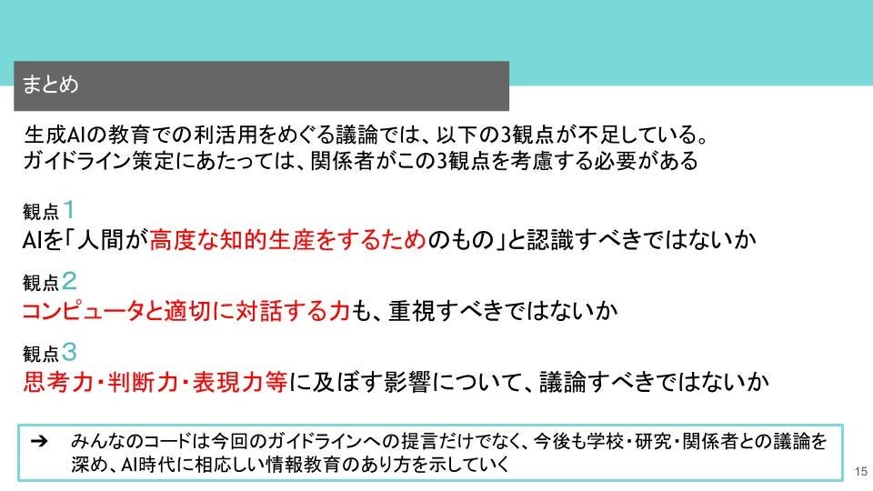 みんなのコードは、すでに学校現場で実証研究を行い、先に述べたAI×教育をめぐる論点に取り組んできたからこそ、今回のガイドラインへの提言だけでなく、今後も学校との研究・関係者との議論を深め、AI時代に相応しい情報教育のあり方を示していきます。