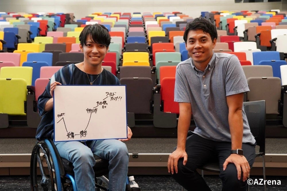 中央大学サッカー部で営業部として活動する持田温紀(もちだ・はるき)さんは、高校生のときに交通事故に遭い、現在は車いすを使って生活しています。自慢の足が動かなくなった失意のなか、彼を救ったのはスポーツの力でした。対談のMCは、フリーアナウンサー・原大吾さん(写真右)が務めています。