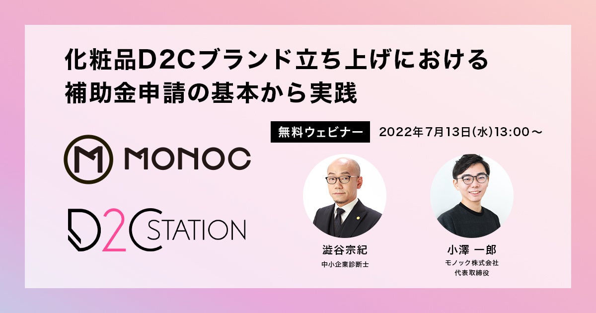 本ウェビナーでは、中小企業診断士の澁谷宗紀氏をゲストに迎え、コスメ事業立ち上げ支援サービス「D2C STATION」を運営するモノック株式会社代表の小澤と対談いたします。