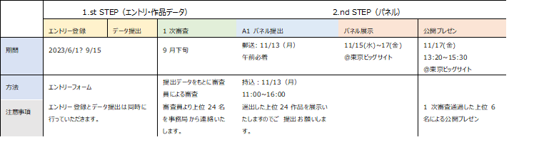 1次審査に通過した場合、11月17日(金)に東京ビッグサイトで行われる公開式の最終審査会に参加してプレゼンテーションをおこなうことが可能な方