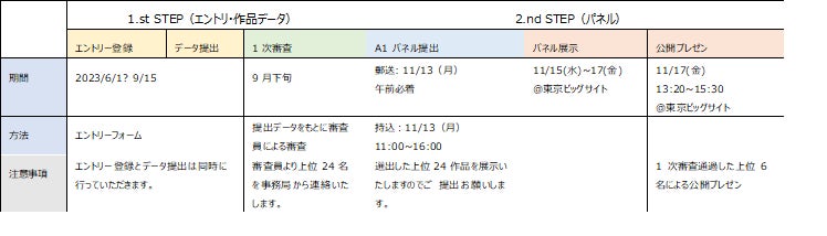 (会場展示)24作品、そのうち最終審査対象となる作品6点を選定します。最終審査対象となった方には11月17日(金)に東京ビッグサイトにて開催される最終審査会でプレゼンテーションをしていただき、公開審査の上で最優秀作品を決定します。会場展示作品については、会場での一般投票による会場投票賞の対象となります。