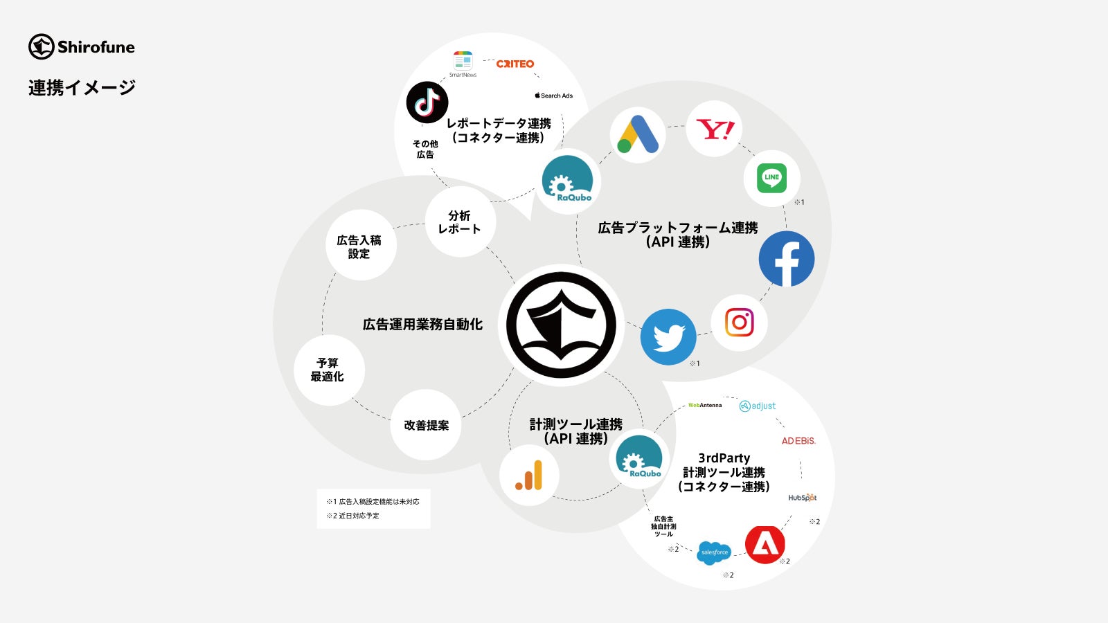 広告運用自動化ツール「Shirofune(シロフネ)」は、主要広告配信プラットフォームの運用業務の自動化