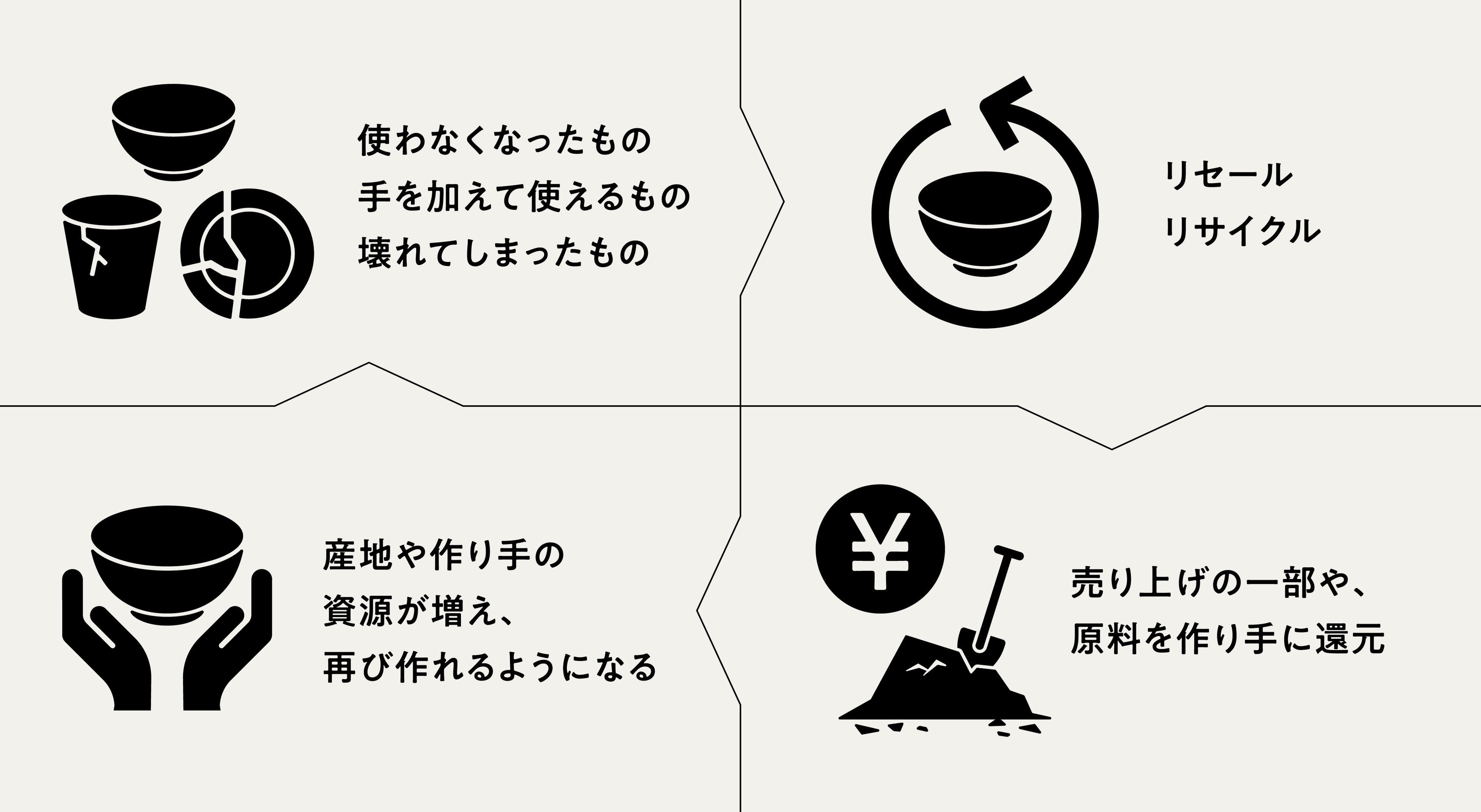 一方で、修繕が難しい状態のものについては、原材料化を進める予定です。例えば陶磁器の場合は、不要陶磁器の再生に取り組む団体と連携し、粉砕・精製を経て土へと再生し、新たな商品の原料として活用します。