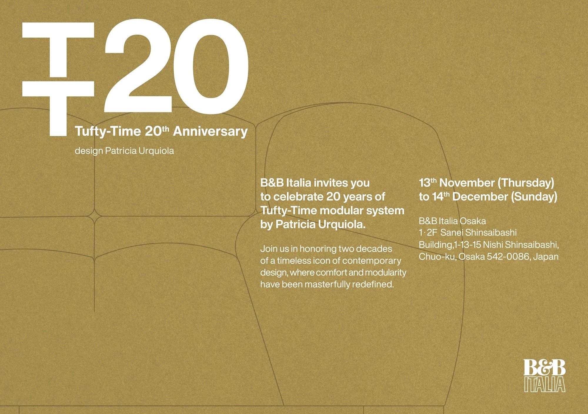 株式会社progetto81(本社:東京都港区、代表取締役CEO:武井 総司)は、2025年11月13日(木)〜12月14日(日)の期間、B&B Italia Osaka にて、発表から20周年を迎えた 「Tufty–Time(タフティータイム)」の最新モデル「Tufty–Time 20(タフティータイム 20)」の先行特別展示を行います。
