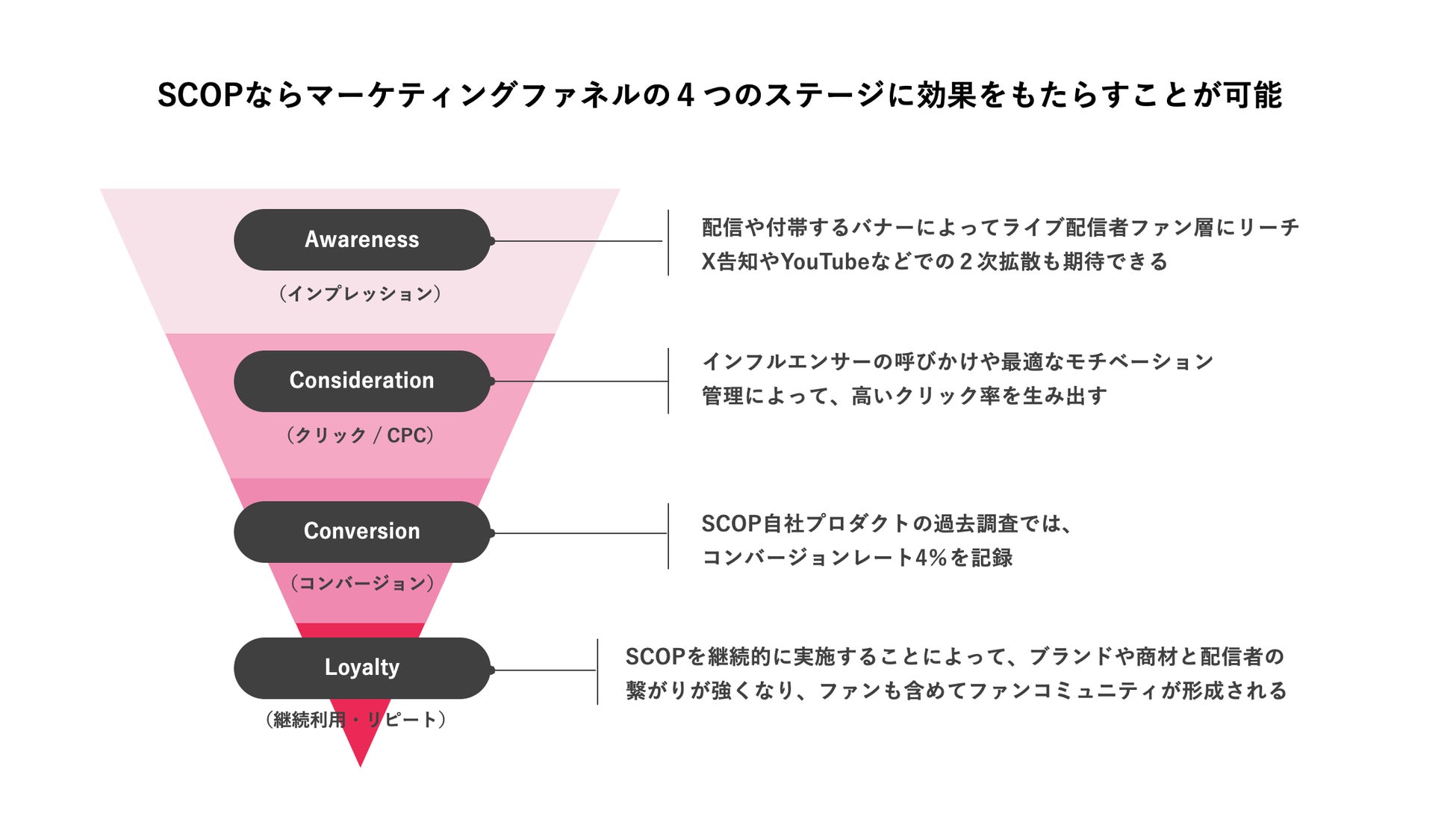共感性と熱量の高いマーケティング施策を推進できるSCOPは、マーケティングファネルのあらゆる段階で高い効果を期待できます。