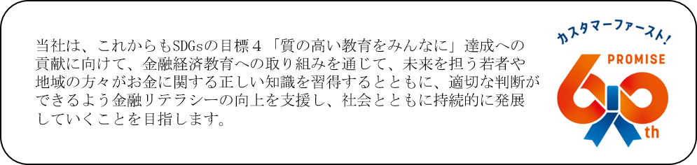 金融教育の推進は、成年年齢の引き下げや「貯蓄から投資へ」という経済社会の活性化にむけた動きなどの環境変化により、我々事業者が取り組むべき責務として社会からの要請も高まってきております。今後もお金に関する正しい知識と適切な判断力の習得を目的とした金融経済教育活動などを通じて、市場への安心と安全を高めながら、その維持・拡大に寄与することでサステナビリティの実現を目指してまいります。