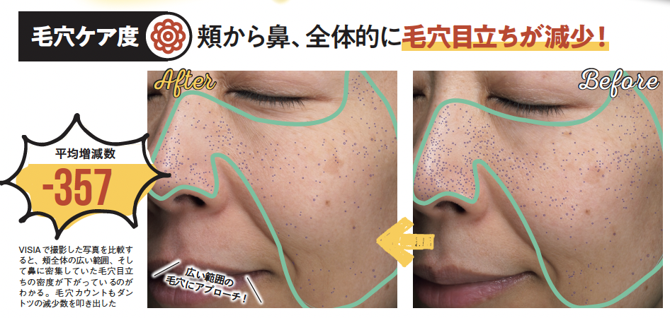 頬から鼻全体に広がった毛穴が目立たなくなり、肌の印象がワントーンアップ。油分が入っていない処方は、オイリー肌との相性も抜群。毛穴ケアにもってこいの一本です!