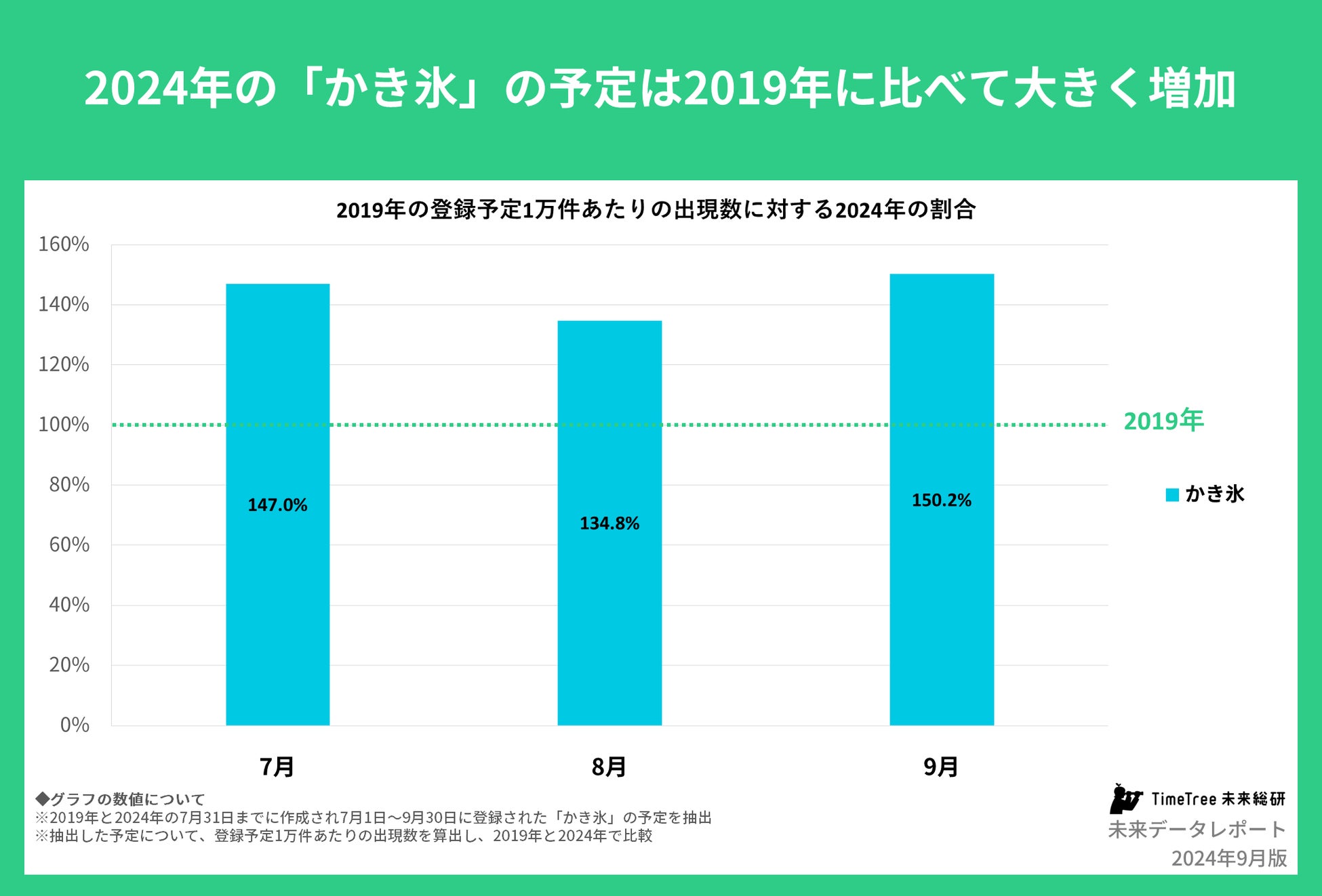その他暑さ対策に関する予定として、2024年は「かき氷」の登録予定1万件あたりの出現数も7月から9月の全ての月で増えていました。近年はおいしいかき氷を求めて食べ歩く「氷活」と呼ばれる活動もブームになっており、夏の暑さが強まるにつれて涼を求める人も増えているようです。