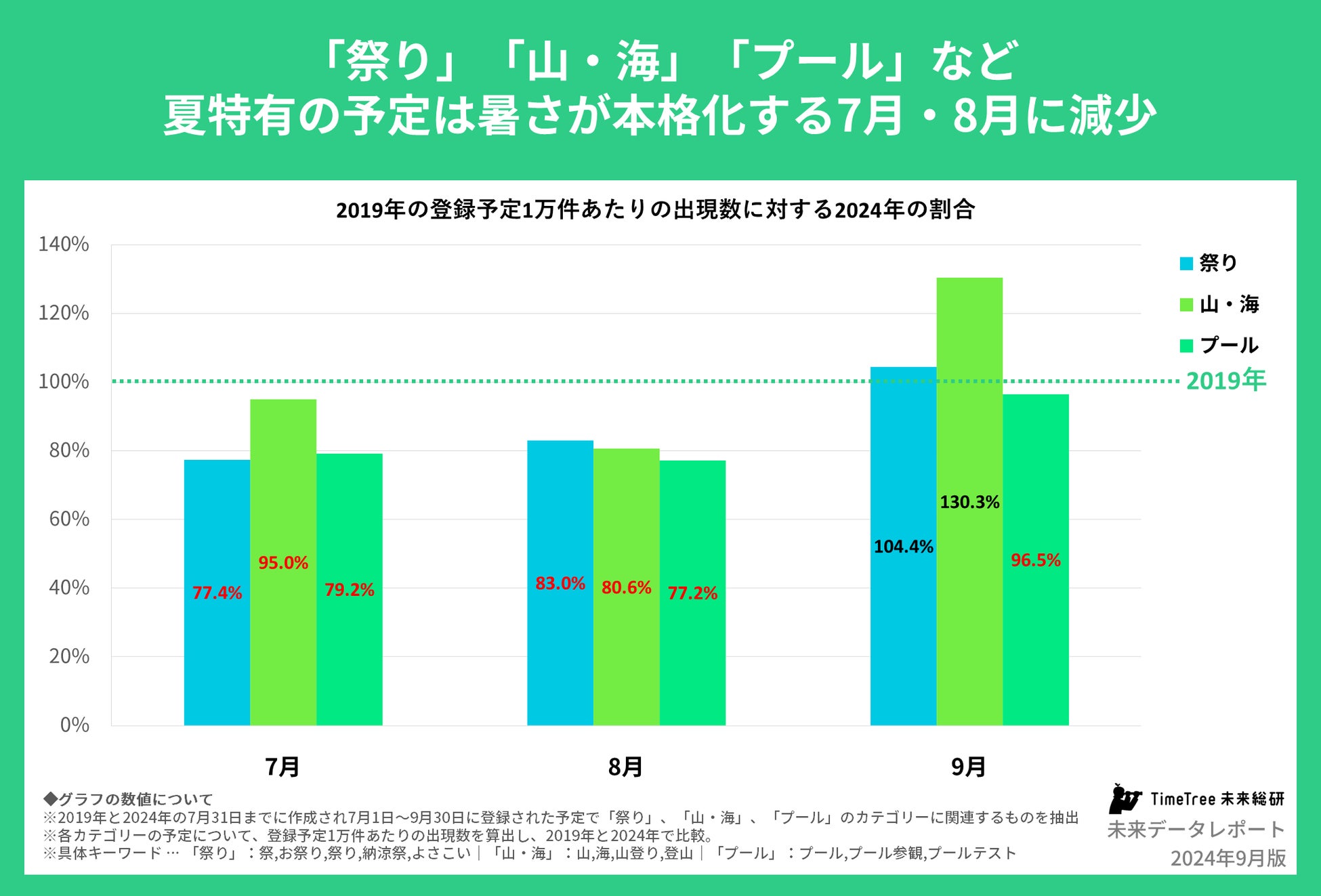 【未来データレポート 2024年9月版】猛暑の2024年、夏特有の予定は7、8月減少傾向に。8月の「山・海」の予定は2019年に比べ約2割減