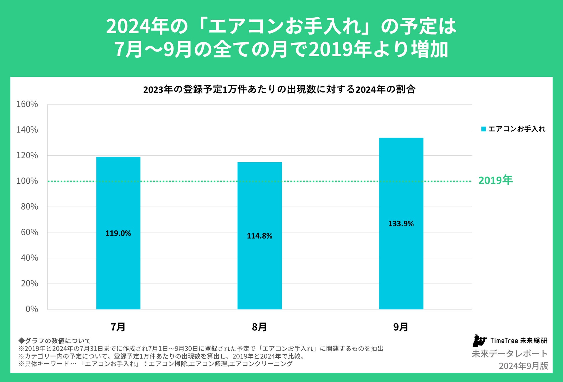 続いて暑さ対策に関する予定に着目してみました。屋内での暑さ対策に必須のエアコンに関する予定を見てみると、2024年は「エアコン掃除」「エアコン修理」「エアコンクリーニング」といったエアコンのお手入れに関する予定が7月から9月のどの月でも増加しており、暑さが本格化したことでエアコンの稼働が増え、お手入れを行う人が多くいたことが推察されました。