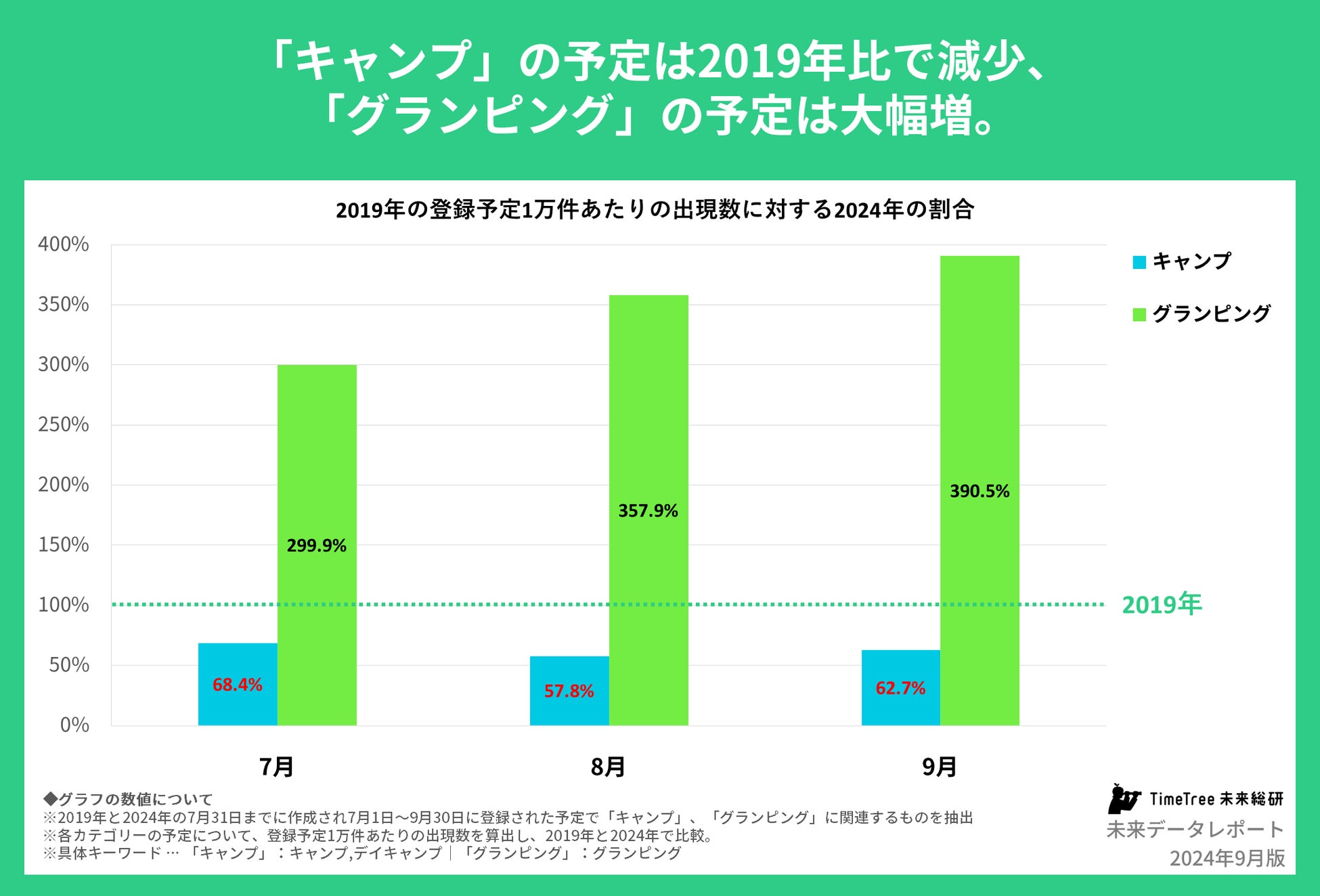 具体的には2024年は2019年に比べ、7月から9月全てで登録予定1万件あたりの「キャンプ」の予定出現数が減少していたのに対し、「グランピング」はどの月でも約3倍に増加していました。このことから、キャンプに比べてエアコンなど設備の整ったグランピングの需要が猛暑により高まっていることが推察されました。