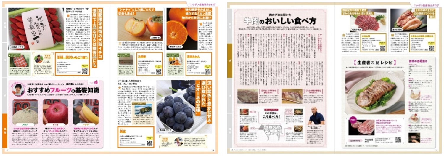 各地から厳選した逸品を、肉、野菜、果物などジャンル別に、生産者たちの声とともに紹介。二次元コードから通販情報ページへアクセスできる、便利な構成になっています(※一部、現地でのみ購入できる商品や、季節が限られている商品も掲載しています)。お薦めの簡単レシピ、ふるさと納税返礼品情報、生産者に聞いた「牛肉のおいしい食べ方」などコラムも充実しています。