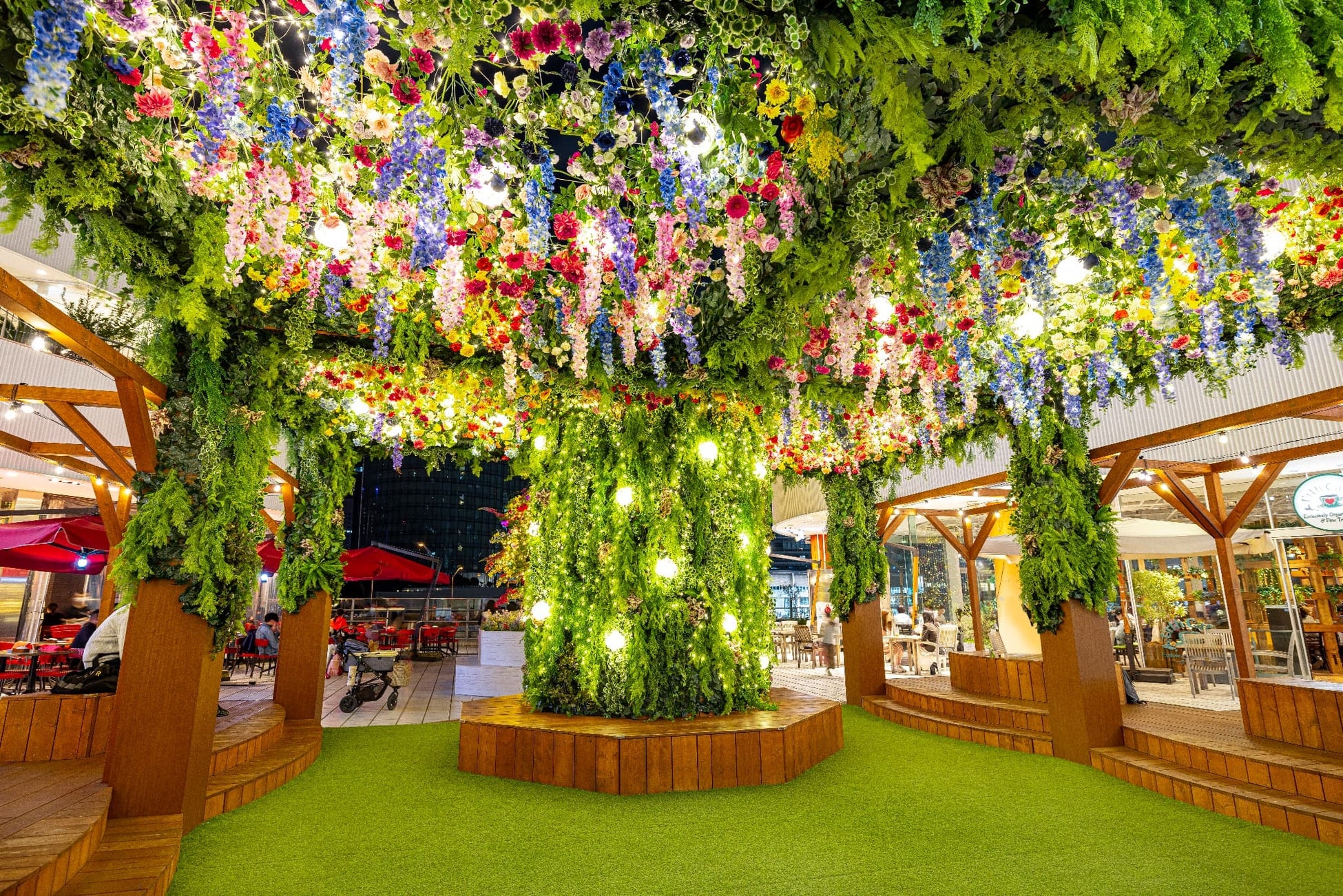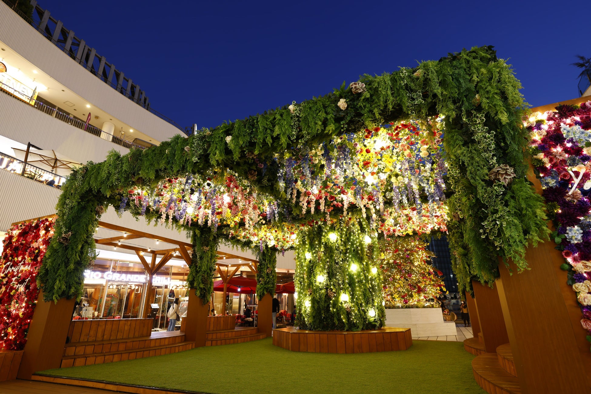広場に設けられたデッキには、幾多の花束が吊るされた「フラワールーフ」や「フラワーウォール」がかかり、昼間でも華やかなクリスマスを演出。