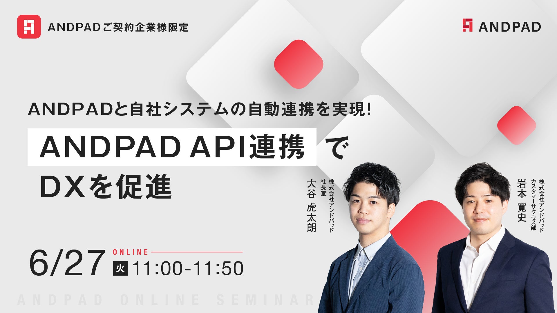 「ANDPAD API連携」の提供開始に伴い、「ANDPAD API」を活用したシステム連携についてオンラインセミナーを開催します。連携の概要やメリット、活用事例をご紹介いたします。各種連携に関するご質問・ご相談も承ります。ぜひご参加ください。※