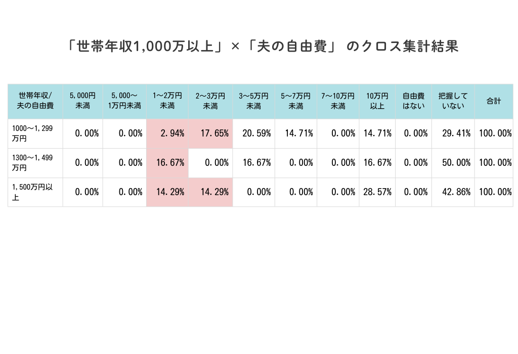 一方で、同層の約3割(16.67%)は「10万円以上」と回答しており、高年収世帯であっても家庭の方針によって夫が自由に使える金額には大きな格差があることがわかります。